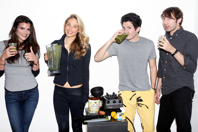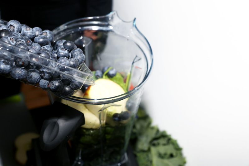 #1: All Out “I'll do kale, spinach, lemon, ginger, scoop of Garden of Life Raw Protein powder [Ed. note: not all protein powders are made alike, we learned], chia seeds, a probiotic, and frozen blueberries, half a banana, and maybe an apple for taste.”