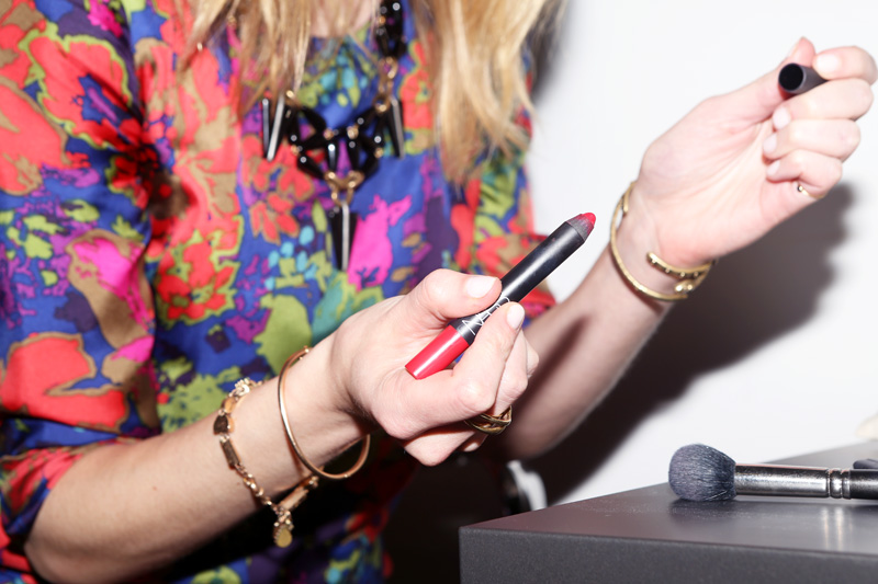 These days, I love the Nars Velvet Matte Pencil in Dragon Girl. It wears really well and I love the tone. It’s so easy to apply and you know you’re going to put it on and you’re not going to end up with it only around the corner of your lips in an hour. That’s my new discovery; I know it’s not new, but it is to me. I’ll put that on my whole mouth and then apply a lipstick over it, whichever one I'm feeling at the moment [right now that's Smashbox 'Be Legendary' Matte Lipstick in Infrared], so that if the brighter colored lipstick wears off, you still have the base color; you don’t have to worry about constantly reapplying or having lipstick in some places and not others. Also, I've found it’s a good way to extend the life of your darker-color lipstick without having to put on a million coats. To me, the Nars Velvet Matte Pencils are a good ‘gateway’ red lip. For beginners, you can put it on really lightly or just a couple dots around and blend it in with a lip balm and you get a blush or a hint—almost like it's deepening your natural color—before you really dive into the red lip.