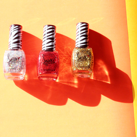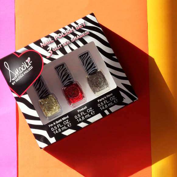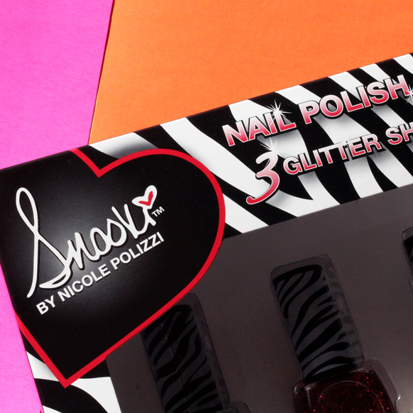 Unsurprisingly, the packaging is rather loud: the box itself is zebra-striped and dotted with lipstick-red proclamations like “3 Glitter Shades!” and “Snooki (TM)!” The bottles are topped with matching zebra applicator handles, and there's a black-and-white drawing of Snooki on the back of the box (her sunglasses are the barcode! which is arguably the best part of the whole set) that looks sort of like a mugshot, if you were allowed to wear Bumpits in mugshots, which we’re pretty sure you’re not (considering one of the points of a mugshot is to record your actual height).