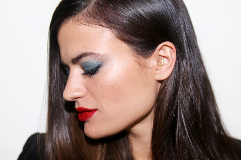 EYES : Remember that old rule, the one that said something like ‘Pick either a bold eye or a bold lip, and go easy on the rest’? Yeah, forget that. It's the holidays! We went all-out (we ain’t never scared) with Tom Ford Eye Color Quad in Emerald Lust, mixing the ivory and lighter-green shadows to create a light mint to use over the whole lid (from the crease down), pumping it up with the sapphire shade closer towards the lash line. It's like a Disney princess' mermaid tail on your eyelid...but in a really cool way, we promise. Line your inner rim at the waterline (Make Up For Ever Aqua Eyes in Star Black) and upper lash-line with Hourglass' liquid Script Pen in Jett (the tip's narrow enough that you can work it between the lashes towards the inner corners, and wing it out to a light cat eye at the edges). Smudge a bit of the sapphire shadow along the lower lash-line to balance out all the lovely madness happening on the top. Finally, pump up your brows (Benefit Speed Brow) and top off with a killer mascara (Lancôme Hypnôse Doll Lashes). Because you're going to get noticed tonight, and nothing exceeds like excess, right?