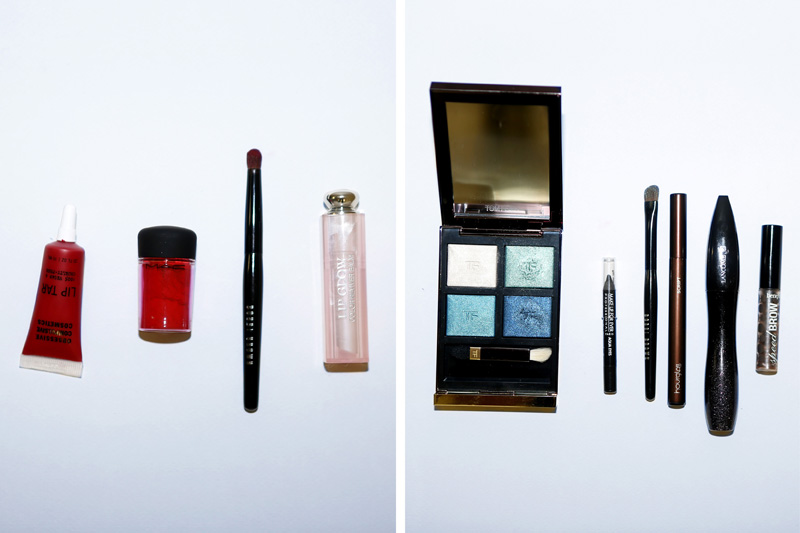 LIPS : For a party-ready mouth (and by that we mean, ready for all the drinking, eating, cheek-kissing, lip-synching, shmoozing, calling cabs, cursing cabs for not stopping, what have you), you need color that’s going to stay put. So thank your lucky holiday spirit-animal for Obsessive Compulsive Cosmetics Lip Tar (we love it in NSFW). It’s just the ticket—the golden (if “golden” was a seriously dangerously deep crimson) ticket. You only need the tiniest daub of product, because Lip Tar packs a serious pigmented punch: dot it on and spread thinly all over your lips. Layer with Dior Addict Lip Glow Color Reviver Balm for a hint of moisture without a sticky, overtly glossy sheen. Then pat MAC Pigment in Basic Red over the whole thing, using the Bobbi Brown Eye Smudge Brush. See, we’re serious about this—that lip isn’t going anywhere.