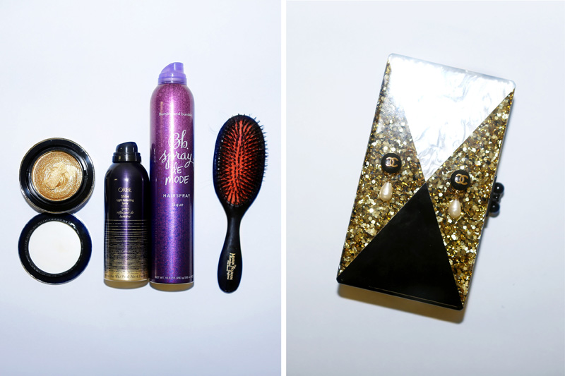 HAIR : The key word is 'shine.' For some extra sparkle, smooth in Oribe's Gold Pomade (the company recommends it for use in convertibles “and other pleasure craft,” so take that as you will) and then douse the finished style with a shine spray (Oribe’s Shine Light Reflecting Spray is great, but not out just yet; Redken has a great one).