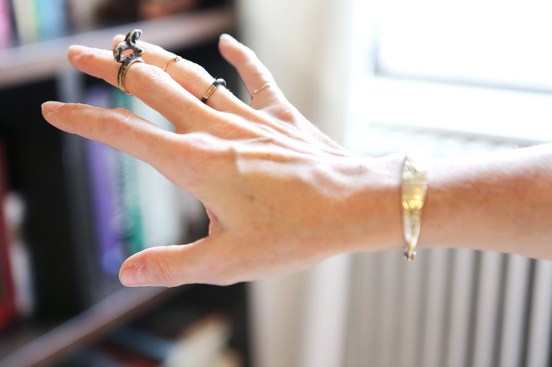 I had long, parted hair for a long time, but I got bangs five years ago, just ‘cause I felt like, I’m a mom, I’m a wife, I live in Brooklyn, I have a business in the city… Having bangs just helped me pull it together and go. Now I really like my bangs; it’s a little bit of privacy. They can really make a look, too—no makeup, a bummy t-shirt, a pair of jeans, and if you’ve got bangs, that’s your outfit. Sometimes, I wash only my bangs—the rest of my hair is whatever, I don’t worry about it—and put on a pair of sunglasses, a bit of Crème de la Mer, and I feel like I’m ok, like I can do appointments or whatever I have to do that day. It’s about the line, the tightness they bring—having bangs is a very clear style. And bangs have always been a very ‘business’ silhouette for me, since you can’t see your facial expression on your forehead; it’s almost like wearing a pair of sunglasses.