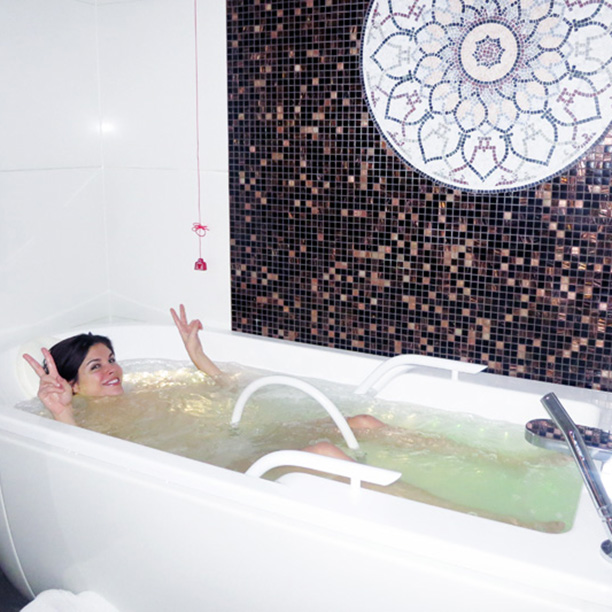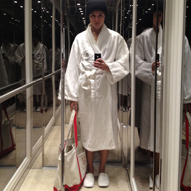 You know the five love languages? It’s really fun cocktail-party fodder, when “What’s your sign?” is too boring: “Which one are you?! There’s 'Words of Affirmation,' 'Acts of Service,' 'Receiving Gifts,' 'Quality Time,' and 'Physical Touch.'” If you’re 'Physical Touch,' then Chenot is the place for you. I haven’t been touched so much since I was in diapers [photo 4]. Every day, I would wake up at 7:30, put on my robe and “hydro-therapy slippers” (just wait), have some fruit and herbal tea, and go downstairs to the spa. Sylvia, an Italian-grandmother-type, would pull away from the group of chattering technicians and say with her thick accent, “Good moooorning!” She'd take me into a private room equipped with a pre-run whirlpool bath and a plastic-covered massage table, dim the lights, hand me a pair of disposible panties and a shower cap, and wait. The first few days, you do the panty-shower-cap-thing but after that it’s like, who cares. Silvia’s seen it all. It goes like this: you slip in to the bath and let the jets massage your body from neck to toe for twenty minutes, the aromatherapy “detox” bath-milk helping shake things up, as tiny Christmas-tree-esque lights tint the water blue, green, yellow, and orange. Silvia reappears, every time, right when the jets turn off, scoops you out of the bath, dries you off, and situates you on the table, where she proceeds to paint your entire body with warm seaweed-mud. We’re talking back, front, everything. She pulls the edges of the plastic tarp up over your body, then the blanket, and, finally, she takes an enormous down comforter out from under the table and pulls it up to your chin. “ Voilà. Like a baby. Goodniiiight,” she says, pressing a button to deflate the table that you thought was solid, your body floating in a heated, makeshift womb. Each time she left the room to let me marinate, I thought two things: 1) What if my nose itches, and 2) It’s crazy that they have white sheets, white robes, and white-leather Mies van der Rohe Barcelona chairs given that they're flinging this green mud everywhere.