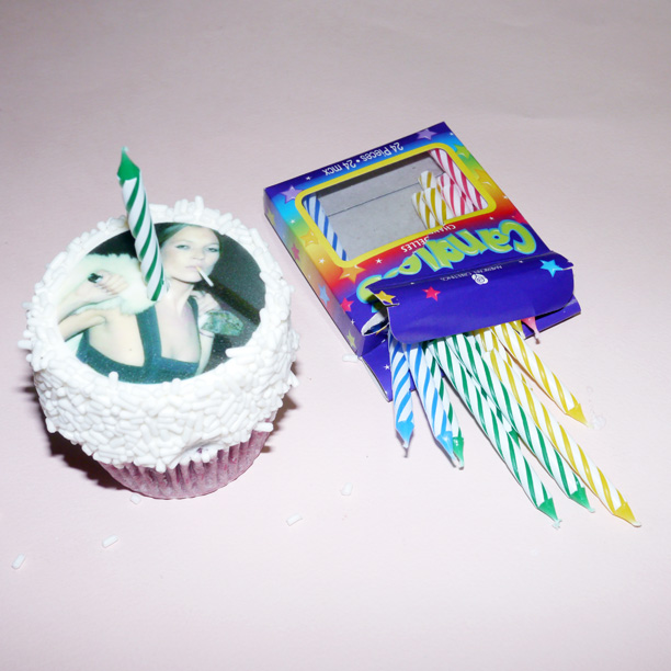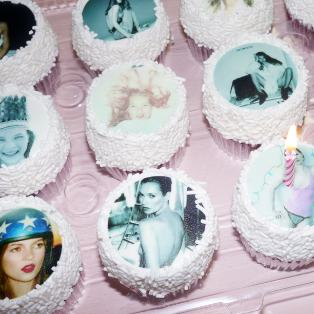 So, supermodel Kate Moss turns 39 today and we decided to celebrate by buying ourselves a dozen red-velvet cupcakes from pastry genius Eleni’s, who we tasked with emblazoning each one with a different photograph from our scarily-extensive image archive of the unsinkable Ms. Moss. We've got her peeking out from a bed with pink locks shot by Juergen Teller, a paparazzi snap with Johnny Depp, an early Corinne Day, some Mario Sorrenti, some Demarchelier, one of the infamous Steven Meisel-Calvin Klein ads, the photograph that some argue launched the “waif' look (that'd be the second Corinne Day, in the pink tanktop [11])...you get the picture. So, here we go, eating our feelings and the woman we clearly love. If you were here, we’d give you one, too, but click through and check out the very, very edible arrangement. Which is your favorite?