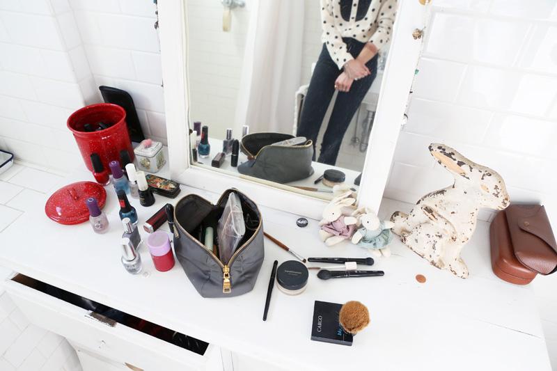 My Viseart eye shadow palette, I’ve had for a really long time. I’ve broken it so many times that it’s held together with rubber bands; it’s so good! I like to make my eyes look like they’re… dying, kind of, so I’ll put a taupe or grey shadow right in the creases. I like the hollow-eye look, but I still want it to look completely natural—like you would never know that I’m wearing anything. Then, I’ll define the eye a little bit with a dark brown shadow—I try to do it with a small brush like an eyeliner, but then smudge it away so you can’t really tell. In the morning, I’ll just do the bottom line, instead of eyeliner. And then if I go out at night, I wet the brush, dip it in a shadow, either dark brown or black, and put more of a defined line on the top and bottom. I’m pretty handy with a brush—I can get it to look almost like liquid liner.