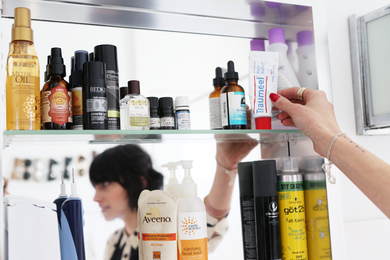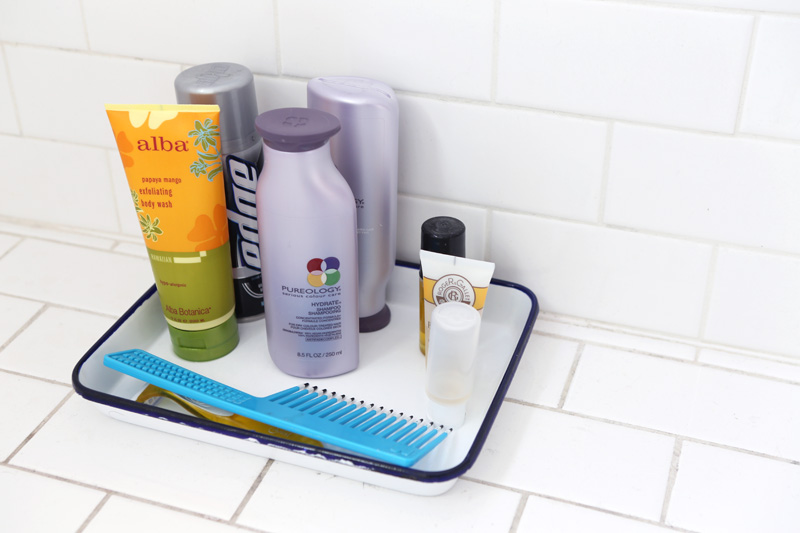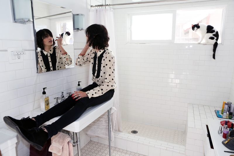 My shampoo and conditioner are Pureology—I think it was my hairdresser who turned me onto it, but they don’t test on animals, and they’re good for people who dye their hair because they don’t have sulfates, which can take out the dye or straighteners, I think. But I hate showering; I try to do it every day, though sometimes it’s like every three days. Since I don’t smell… and if your hair looks okay, then you’re fine! Keep on rolling. I’ve been really into hats lately, too, so that helps. [Laughs] But I do wash my feet daily. I don’t wear socks during the day—I only wear them when I sleep—and my feet get a little smelly, so I’ll sit in the sink at the end of the day. It’s like a mini bath.