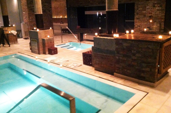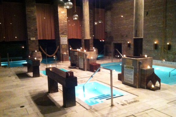 Aire Ancient Baths, 88 Franklin Street, New York, NY, (212)-274-3777. 2 hours of access to the baths is $75; $140 with a 60 minute massage. The ritual packages (olive oil, cava, wine) run from $450-500 per person.