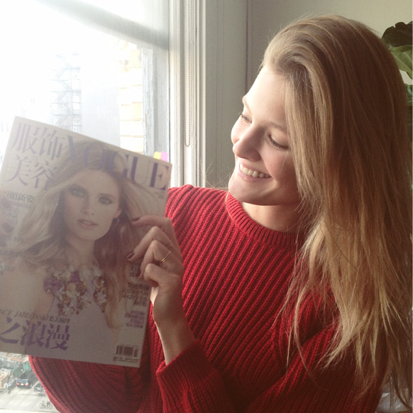 The 21-year-old French model swung by the Gloffice this afternoon to say hi, and, seriously, could she be any cuter? She brought us coffee. COFFEE. From the prettiest girl in the world. In exchange, we gave her our copy of February Vogue China, since she's on the cover.