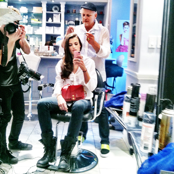 The best tip ever [I should interject here that my hairline possesses two patches at the temples of what I call either “baby hair' or my “party horn(s “ for their tendency to flip up and out in thin tufts when my hair's pulled up, most often visible in photos from nights out]:'For those little fly-aways that people get around their hairline or crown, I take hairspray and either a men's shaving brush or an eye-makeup brush, spray it with Flexible Hold, and brush all those hairs down. Hair takes down [other] hair the best. And now, you're ready for HD... Or as ready as anyone ever is?”