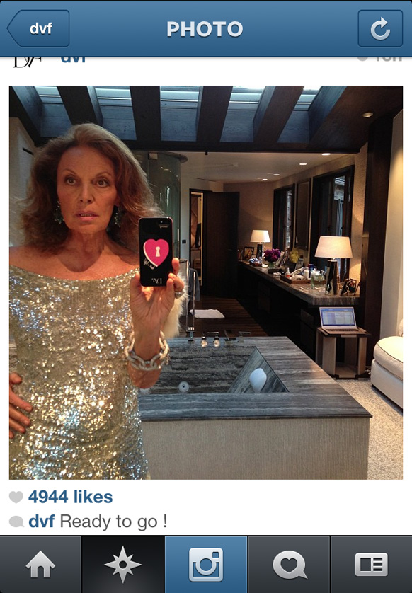 I don't know what you've been looking at or talking about this morning, because forget the Oscars. Forget them. The only thing that mattered last night happened on Instagram, when Diane von Furstenberg posted a pair of pre-party selfies from a bathroom that we're pretty sure we'd sell our soul to hang out in, let alone actually bathe in. The orchids, the marble tub, dangling flat-screen television, the perfectly plumped white cushions on that couch. Why would you ever leave? Seriously? We wouldn't. Also, photo #2 proves that no 66-year-old is cooler than DVF.