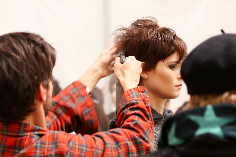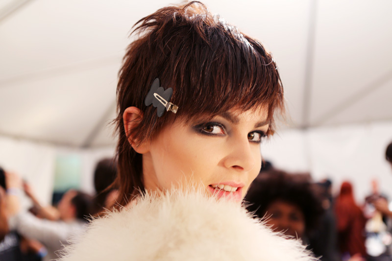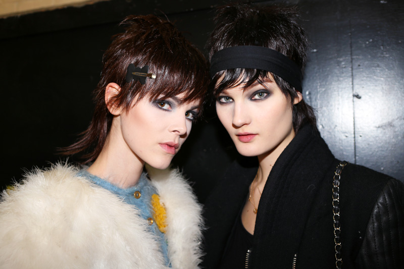 Oh, Marc. The city's biggest designer closed out NYFW last night with a dimly lit, glam-heavy—sequins and fur and cashmere, oh my!— extravaganza that was heavy on the attitude and, beauty-wise, light on color (i.e., monochrome, or “like a black-and-white photograph,” according to François Nars). Guido used a razor to hand-shape 55 different wigs in varying shades of brown (12 were light, 43 were dark) purchased from Helena’s (the very place James Pecis told us was the mecca of faux-hair) to create a chicly mulleted clone-army of cool girls — the kind, Guido noted backstage, “that Marc [Jacobs] likes... the inspiration was a lot of girls in the '90s; an English girl called Edie Campbell,” as well as a 2000 Vogue Italia photoshoot with Kim Peers. Palau spritzed water and sprayed Emily's beloved shine flash from Redken to give the wigs extra height and an almost sweaty sheen. It was grungy, choppy, rock ‘n roll—a far cry from the slicked-back chignons or tight ponytails we’ve been seeing everywhere else this season.
