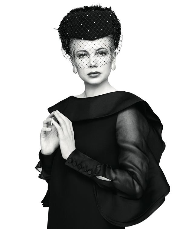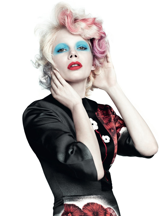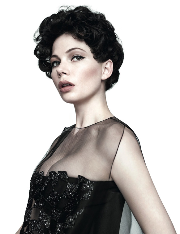 As for Williams' various 'dos, Paul “definitely rolled up with a lot of bags of hair and a lot of assistants,” he told us on the phone this morning, noting that the peroxide-blond, pink-tinged wig was one he’d been “working on for awhile,” while the tighter-set dark wig reminded him of a young Isabella Rosselini. “Michelle has beautiful, beautiful hair and a very cute haircut,” he said, so for the shots where her natural hair was used, it didn't need much. “I use Bumble and Bumble’s Thickening Spray a lot, and I kind of overuse it,” he added. “I really soaks the hair with it, and that enables the hair to have a tremendous amount of hold and flexibiltiy and changeability' for the subsequent blow-out and top-up with Bumble and Bumble Styling Creme. “That’s my secret weapon and those two products are sort of my recipe.”