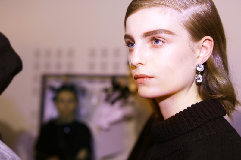 Lucia Pieroni (Clé de Peau): It’s a gorgeous, very chic, handsome-beautiful woman, a little bit like a Lee Miller-type woman. You know, those women in the '30s and '40s that just had these beautifully sculpted faces with big eyes. They were a little bit masculine, didn’t realize wear much makeup, and they were just gorgeous. We’re doing a big, strong, slightly masculine eyebrow, a handsome eyebrow, meaning the arch is quite far out, for a straighter look, and then some highlighter in the usual places, the Luminizing Face Enhancer in #11 and #12. I’m doing a little bit of contouring, but not too much because I think when you have this gorgeous profile, contouring too much can make one look quite deathly. Plus, we wanted to reference the women in the '30s and '40s, who didn’t have time for makeup because they were far too intellectual for all of that, so they would just whack on a red lip, or nothing, and go out. Then, we’re using an eye shadow, the Eye Color Quad in #208, and putting it on the lid and underneath the eye so you can just blend it out. It’s not actually about the eye shadow, it’s about giving the eye, itself , a slight shadow. So there’s no kohl, no lashes, and there’s no mascara, so you still retain the fold of your eyelid. When you curl your lashes and add mascara, you lose that area of the eye, and it’s actually quite beautiful, I think. Mascara can be very pretty—it helps make a very doll-like eye—but if you're trying to get a strong message across, and you do strong makeup and then “pretty' eyes, it's not the most powerful thing. On the lips, we’re just using the Extra Rich Lipstick in #101 which is a super-natural nude color, with a little bit of pink showing through. I honestly don’t think it works on everyone, the nude-red, but how you get around that is by adding a little bit of concealer or foundation to your lip, very lightly around the edge, which blocks out the color of your mouth and then you add a little bit of the nude lipstick, and then it works. You have to make sure that you’ve cancelled out the natural pink of your lip, basically. Today, the girl is very beautiful but she’s kind of boyish at the same time.