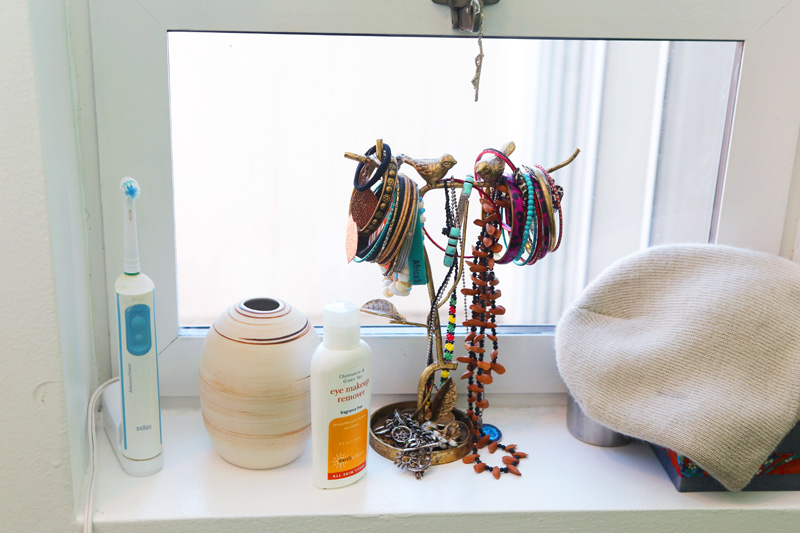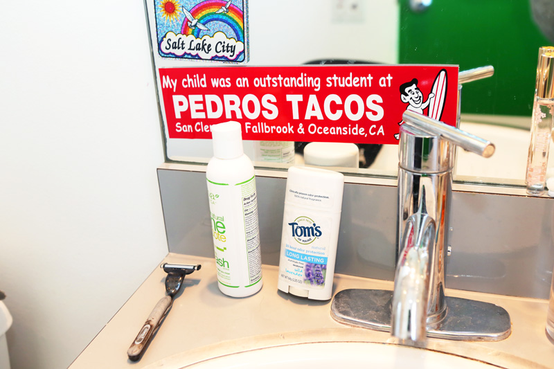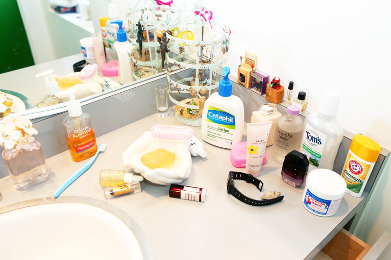 My mom is really into all-natural everything, so I have Tom’s of Maine mouthwash and I was using Tom’s toothpaste for a while, which really sucks—I don’t recommend it [Laughs]—and Tom’s Lavender Deodorant, which I think makes me sweat even more. So, I don’t like it. I use Egyptian Magic for everything—hair, body, and face. It’s pretty cool. It’s not what the kids are using these days, probably not. The only hip thing in my bathroom would be, like, the Cetaphil lotion or maybe even like that Lush Bath Bomb…but I feel like I’m behind the times. I do have a Burt’s Bees Rosewater Toner that I actually really like—it just closes up your pores after you wash your face, and it smells like roses.