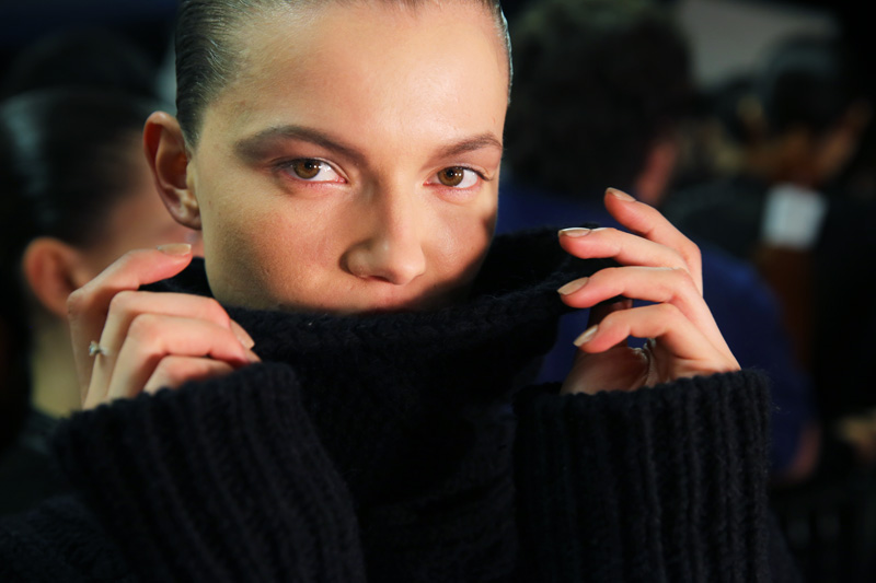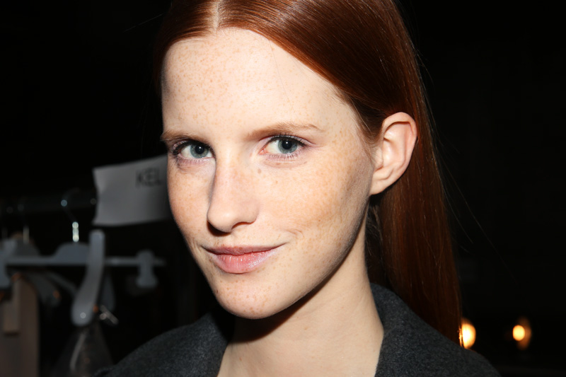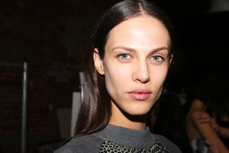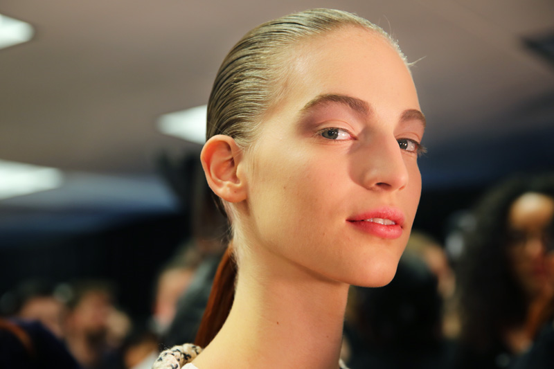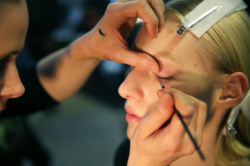 James Kaliardos at Theyskens' Theory (where the look was clean and fresh sculpted faces with a little peach-toned concealer on the eyelid and not much else) was inclined to agree. “I think the girls look so beautiful—beautiful in a really pure way. As opposed to, like, 'pretty because I'm wearing mascara' pretty, it's more of a concept of pretty, pretty like how we were born...'born-this-way' pretty. Which is harder to do,” So no mascara? At all? “No mascara. I think because it's about your natural lash, which is softer, so it immediately softens the eye,” But what about our years spent trawling the aisles of Sephora for the perfect width/lift/curl?! “A lot of designers and stylists think mascara looks 'commercial,'' Kaliardos shrugged. “They've said that a lot: 'No no no no no mascara!' They're really strongly adamant about that,”