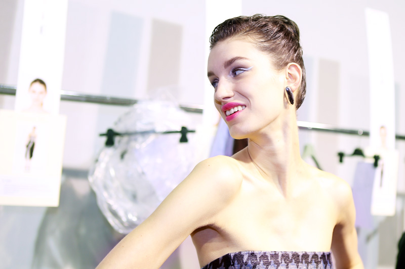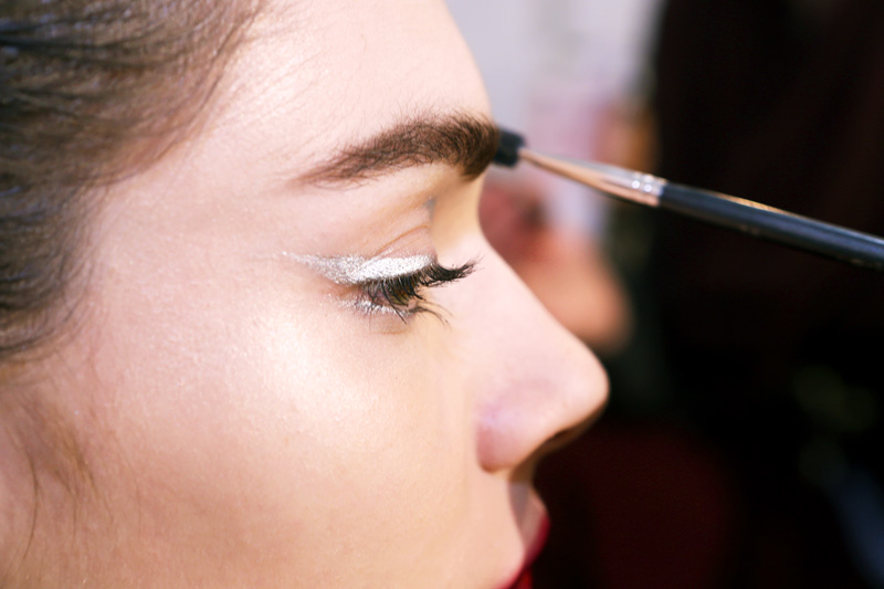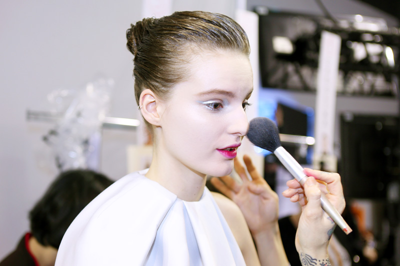 Pat McGrath (Dior): Today, it’s the Dior woman that we know, but a very modern take on her. For the eyes, we did metallic eye wings using wet silver eye shadow pigment [Diorshow Mono Fusion in Étoile #21], and then a beautiful matte pink lip [Rouge Dior lipstick in Darling, out in September]—the color's more concentrated on the inside of the mouth, and faded toward the outside. Otherwise, it's just about perfected skin and highlighted cheekbones, using the Skinflash Primer. It's very much a modern take, very much like 'air,' very fresh—a futuristic take on a Fifties woman.