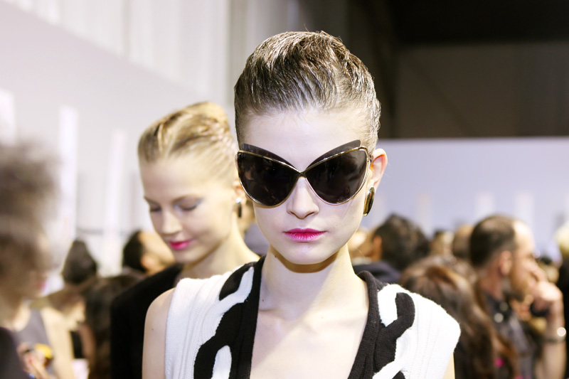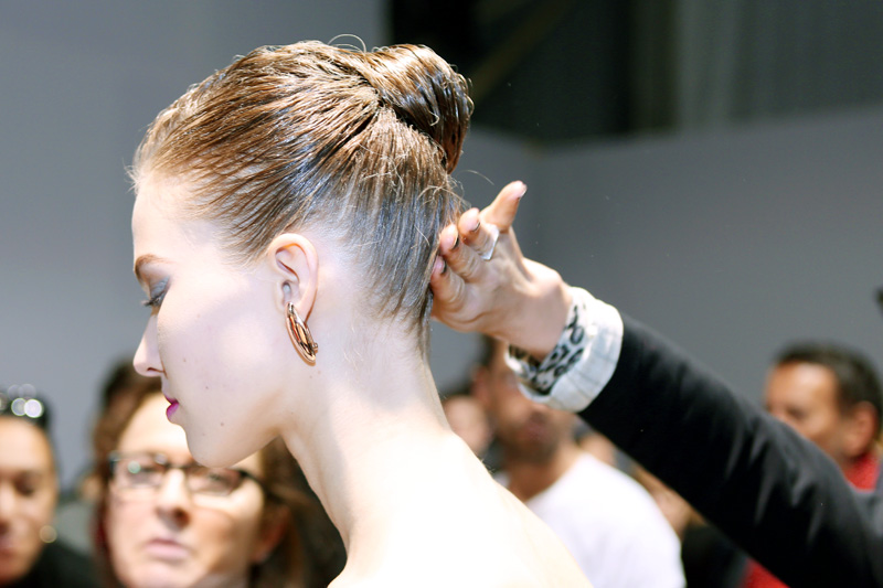Guido (Redken): It’s a classic Dior style, you know, slightly Fifties. I’m using the Guts 10 foam and a very generous amount of Forceful 23 hairspray to make it look wet—as if she was caught in a moment, maybe the rain...it gives the hair a filmic quality. I didn’t have an inspiration, really; it’s more about doing what’s right for Raf and what’s right for the clothing. It’s not that often anymore that a designer says that he wants the hair to reflect a certain person, like an actress. It’s really more about the DNA of the brand and being true to his kind of woman. It’s a modern woman.