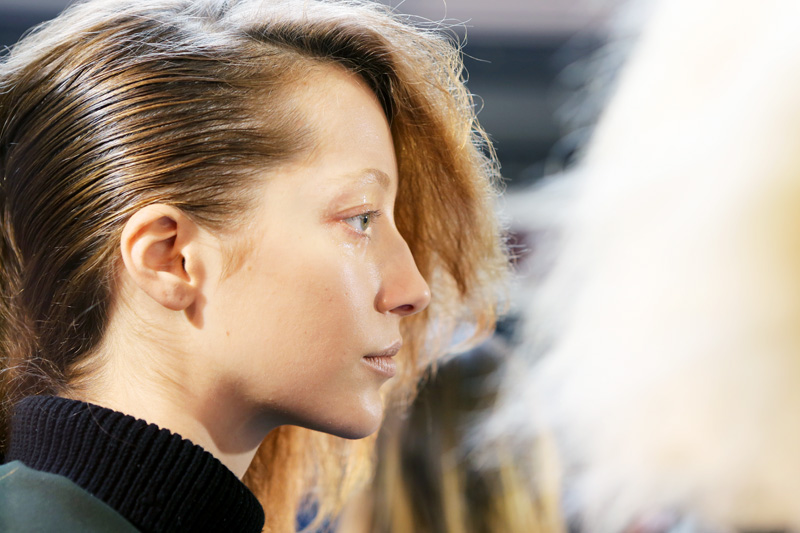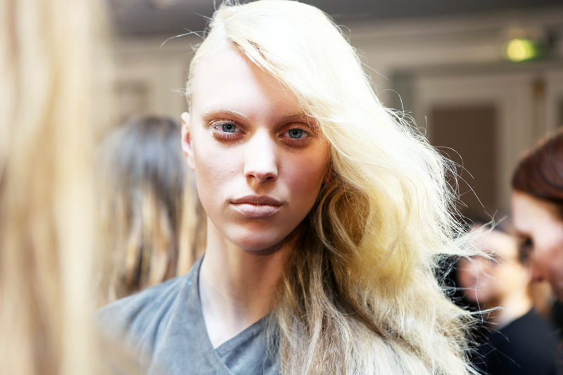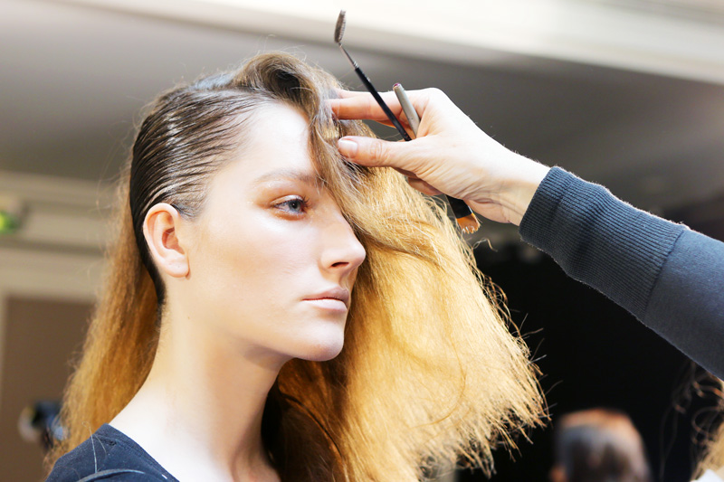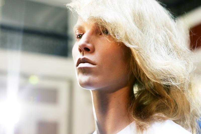 Paul Hanlon : It’s kind of a “fucked up Debbie Harry,” or how a girl would interpret that. There’s a bit of a punky vibe, a bit club-kid-y, and a masculinity to it: on the combed side, we've kept the comb marks quite visible, like a guy's hair. There’s also a slight reference to Jerry Hall, but it's a bit more of a Jerry Hall-on-acid type thing. Like a Factory girl, the Warhol lot, but a little bit cooler— not at all 'lady.' I think if you do 'lady hair' with these clothes it's going to look like you’re doing an old Thierry Mugler look, and I love that, but this is not that. This girl is young, like a kid in a club who’s done her hair in the bathroom. It’s bad hair, overprocessed, chemically treated hair, not with a crimp, but a frizz to it. And it's still going to move a little bit, even though it’s got that candy-floss texture.