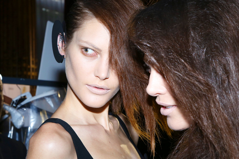 Charlotte Tilbury (MAC): The look today is based on a mannequin, New Wave, and a nude palette. It’s all kind of nude-upon-nude, with Studio Finish Concealer down the center of the face, contouring under the cheekbones with Sculpting Powder, and beige-ing out the lip with the Studio Finish Concealer. With the lip, sometimes you have to use a darker concealer, depending on the skin tone. Then, we put a bit of a sepia shadow around the eyes, and added some Lipglass on the lids, and underneath the eyes—almost like she’s been crying. Then, we pat Prep & Prime Loose Powder down the center of the face and that’s it. Can you put Lipglass on your eyelids in real life? Well, it’s going to fall inside the eyes...you can do it, but it’s going to be tricky to control all night.