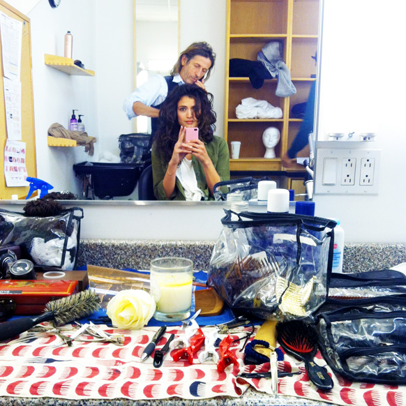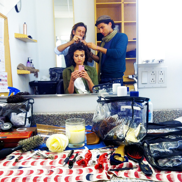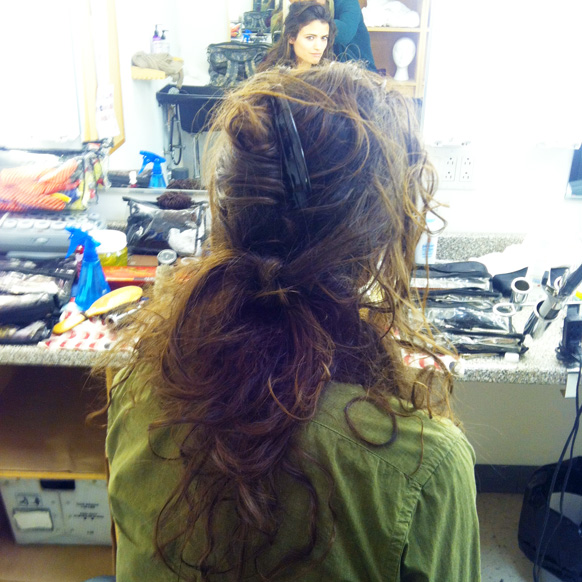 First, sections of my dry hair were wound into rolls that he clipped up (and that I subsequently threw a hoodie over, so as to roam around the set looking like someone’s grandmother lost in the frozen foods aisle) and set via a concoction sprayed from a label-less Windex bottle. “This is my own beach-salt-spray,” D'ys said, and his hair is what appears to be a series of faux-dreadlocks (in that sort of killer '90s movie way, where you know he bathes regularly but still gets that insouciant, mussed-up texture), which he explained he creates by washing his hair, twisting and spraying it with this same stuff. He removed the clips and tousled my hair with a blow drier, securing it half-up with one of the aforementioned combs and tying two sections of my hair into a textured knot below it. Note: I have since tried to duplicate the hair knot/comb combination myself. It has not worked, try as I might. It would appear that having your hair done by a hair genius does not, sadly, make you a hair genius. Such, I suppose, is life.