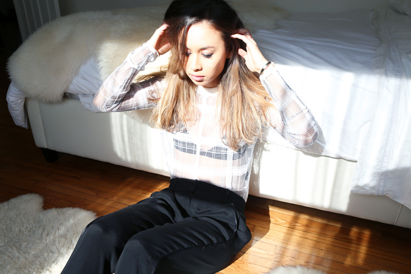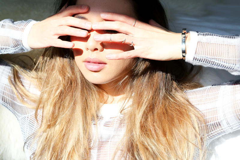Right now, my hair is ombré-ed. I think it started by accident—it was 2009—because I was bleached blonde. It just looked awful—so wrong with my complexion. I guess I was feeling it at the time, but when I look back at the photos now, I’m like, ‘I look so sallow.’ The whole yellow-undertone Asian thing just was not working with that. Anyway, it got really damaged from that obviously, and I decided to stop touching it at all and just let it grow out. That kind of looked cool; I wasn’t doing anything with it for months and months and months. All of the blond eventually grew out, and I thought, ‘I think I’ll do that again.’ So, it’s been a yearly process—I’ll go and have them dye from half-way, down… I haven’t found a colorist that I would go back to for the whole process because they don’t really get it. They always put the bleach in too high, so I always have to go in and correct it, and it turns into a huge, annoying process. But, I’ve been to people that have been really good at fixing what the last person did! [Laughs] But then, I also don’t really care, I’m just like, ‘Oh, whatever. It’ll grow out and look normal-ish in a month or two.’