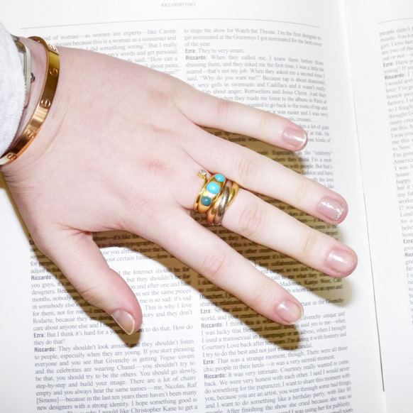 “Just one coat,” Emily explained, reciting the instructions the manicurist gave her backstage. “It looks like your nails are still wet.” And just like that I found the perfect solution to my nails-too-short-and-it’s-no-fun polish problem. With just a bit of shimmer (no heavy pieces of glitter dominating the bottle) the Thakoon polish, Priti’s Bristol Fairy, was like the clear topcoat’s much cooler, ‘funkier,’ older cousin. Once applied, it’s almost unnoticeable—which means clean nails are a must—but the wash of iridescence keeps your nails looking freshly painted long after they’ve dried. And because I have a hard time sticking to just one polish and always feel the need to spice things up a bit, I decided some extra glitter on an accent nail was just what my fingers needed. A little extra pizzazz, if you will.