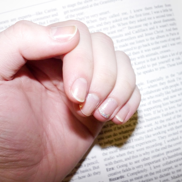 It can, however, be hard to keep my nails looking good when they are so short—especially when the black, or otherwise very dark, polish I typically wear creates a harsh contrast to my alabaster skin. What to do? The typical answer would be either to stick to just a topcoat or a swipe of nude. But that’s not my thing. I don’t mean to strike you down if you’re into that, but to me, that always seems a little boring when you have the option of literally any color, or finish, or sparkle, ever. So, when Emily walked into the Gloffice after the Thakoon Fall 2013 show with what she exclaimed to be the coolest nail polish of the season—a clear, semi-matte liquid with clear glitter—I certainly took notice.