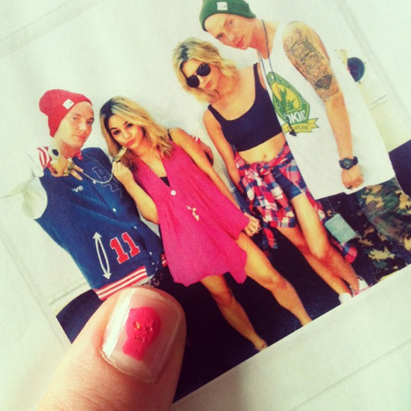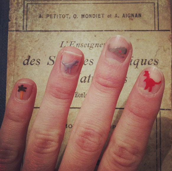 So, the idea of doing this manicure actually came from my best friend, Gabriel, who suggested that I paint the dinosaurs from Jil Sander's men's sweaters on my nails, with toothpicks. And so I did [2]. Then, a few days later, we went to the premiere of Spring Breakers [3-4] and I loved the movie so much that I wiped away the cute diplodocus and whales I had drawn in order to pay director Harmony Korine a nail tribute.