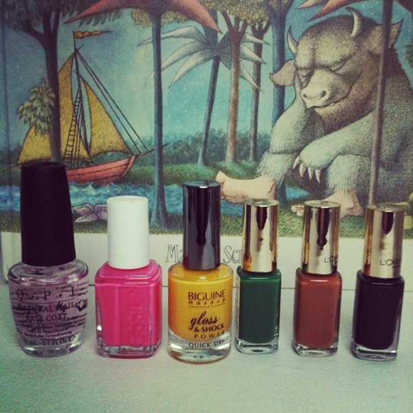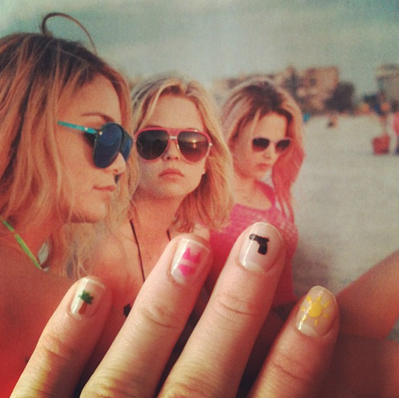 Anyway, the little nail drawings were quite easy to figure out; I chose to do a palm tree, a bikini, a gun, a sun, and a knitted ski hat (like the ones they wear in the final scene) on each of my nails. I pulled out my O.P.I. Natural Nail Base Coat (which I also use as a top coat), Essie's Off The Shoulder , Biguine's Yellow Mustard, but also green, brown, and black colours from L'Oréal (#612, 114, 702), plus a few toothpicks, which I use as brushes. As for the result [5-8], I have been looking at my nails all day for the past two days, showing them to everyone and therefore talking about Spring Breakers way too much. I haven't been this obsessed since I saw The Darjeeling Limited.
