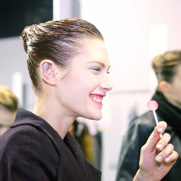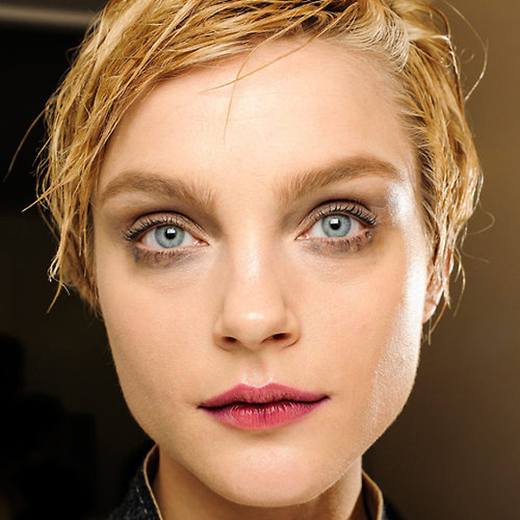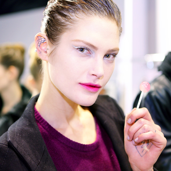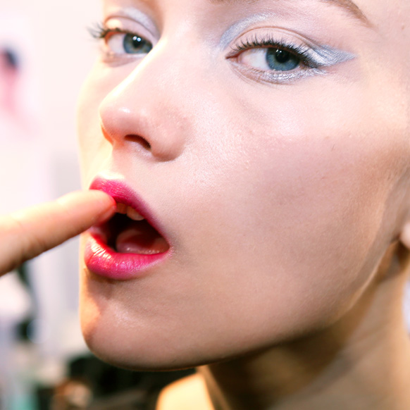 In the opposite of real life— backstage at Christian Dior, two hours before Marant’s show—Catherine McNeil was not making out with anyone, but she was enjoying a lollipop while rocking a decidedly French Kiss mouth. Pat McGrath was deep into a multi-part makeup process that utilized fuchsia lipstick, powder, and a helluva lot of tissues, blotting down and building up models’ mouths to achieve a haute-er version of the multidimensional, soft-focus pout that you’d normally be sporting after your lunch break, or that you’d see in your rear-view mirror on the way home from work. It looked lived-in...in that Sky Ferreira, my-lips-have-frostbite way.