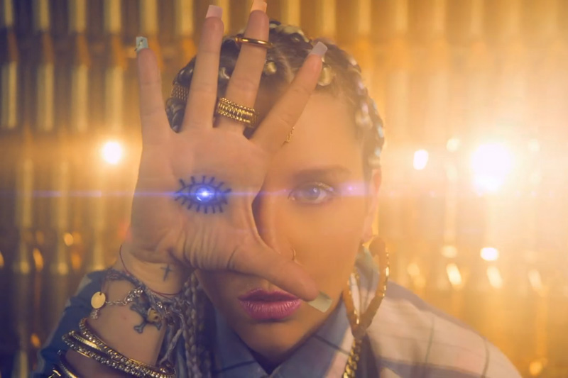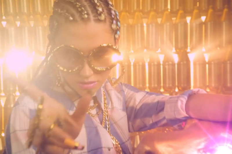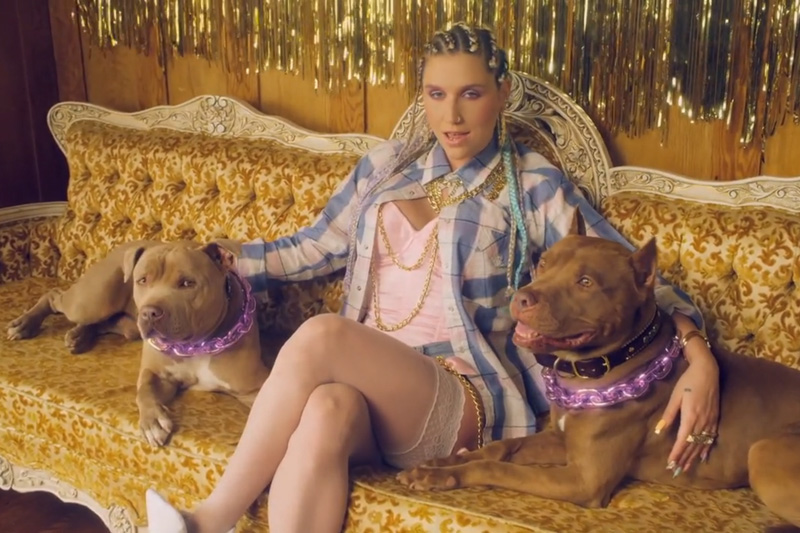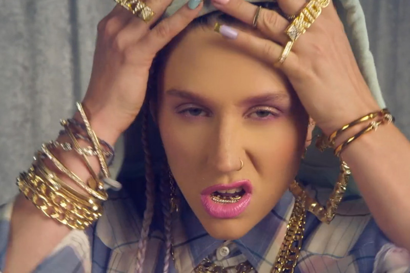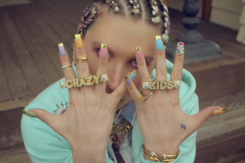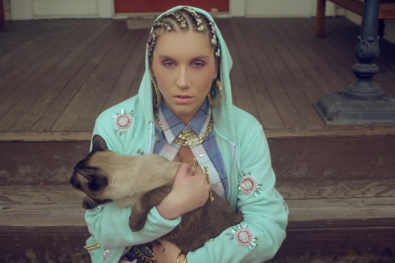 Setting aside however you might feel about Ke$ha and her particular brand of dirty pop, can we all appreciate a real commitment to a look, as evidenced by the pastel-hued, seemingly Riff Raff-inspired wardrobe and beauty in the singer's new “Crazy Kids' video? The ribbon-accented braids, layered bling, press-on nails (one of which has its own hoop earring!), and coordinating Pepto pink eye and lip might not be everyone's cup o' Jameson, but we were mighty impressed with the color story. And then you watch it again and pick up on the crystal eye tattoo on her palm, uncomfortable-looking grill, and that gold-lidded Veronica Lake moment at the end and you think, Good for you, Ke$ha. You do you...or, you do James Franco-in- Spring-Breakers...but whatever! Props on the execution.