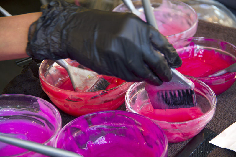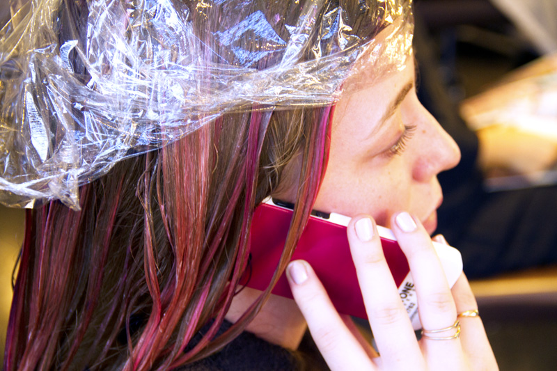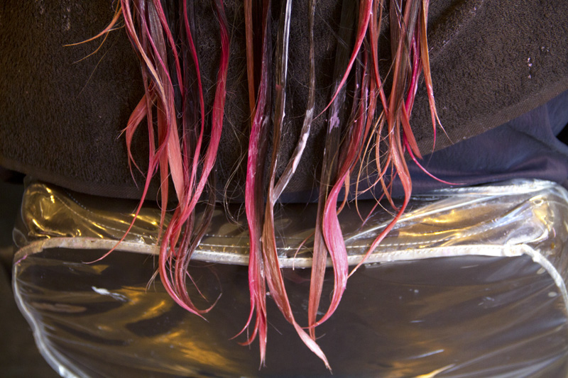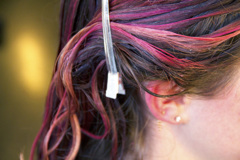 With six bowls of vegetable dye [5] on hand, I said goodbye to my flaxen hair, and put my tresses in the hands of an expert. “These are 'direct dyes,' which means the color molecules are big enough so that the color you see in the bottle is basically the color of your soon-to-be hair, and they're very temporary. As it fades out over the course of three to six weeks, it will be a different color every day. I love that. If you want to make it last, take lukewarm-to-cold showers, which will help keep the cuticle closed and the tone in. I generally recommend using a Wella Brilliance Treatment Mask for Fine to Normal Colored Hair to help with that, as well. It just seals everything in.” Sold. (Aura's a spokesperson for Wella, I should note.)
