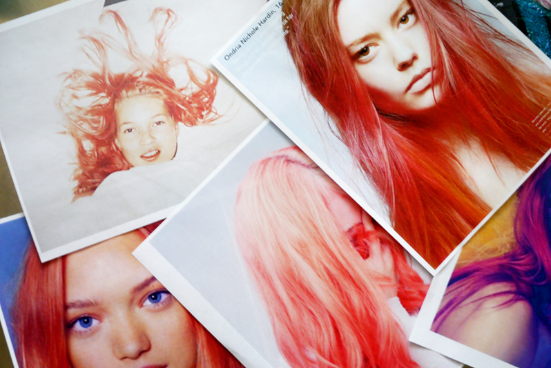 Perhaps the idea came from my laptop wallpaper: Kate Moss photographed under the covers by Juergen Teller [11]. Or maybe it was my desktop at work: Malgosia Bella shot by Camilla Akrans for Vogue Spain [12]. Or maybe those two images are actually evidence of my unconscious drive to dye. (Catch that, Sigmund?) In any event, a week ago, I felt the urge to go pink.