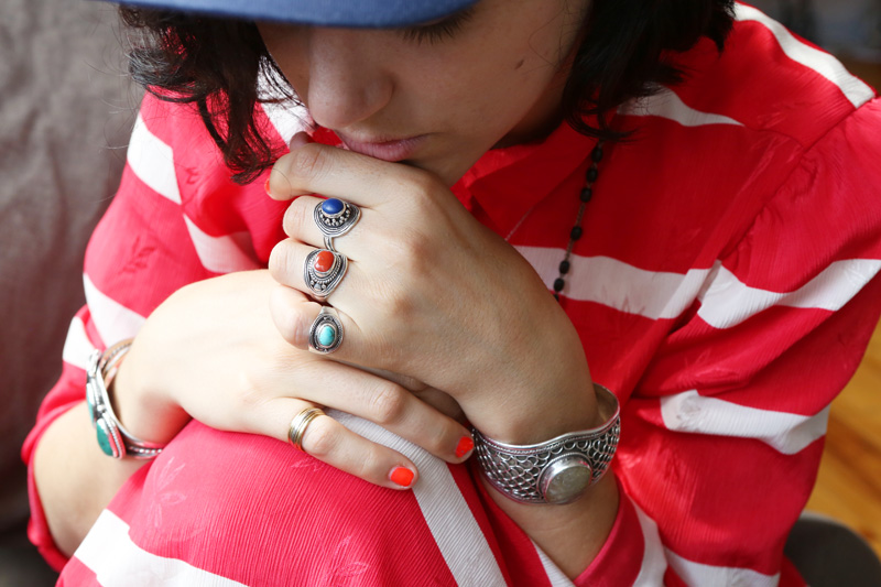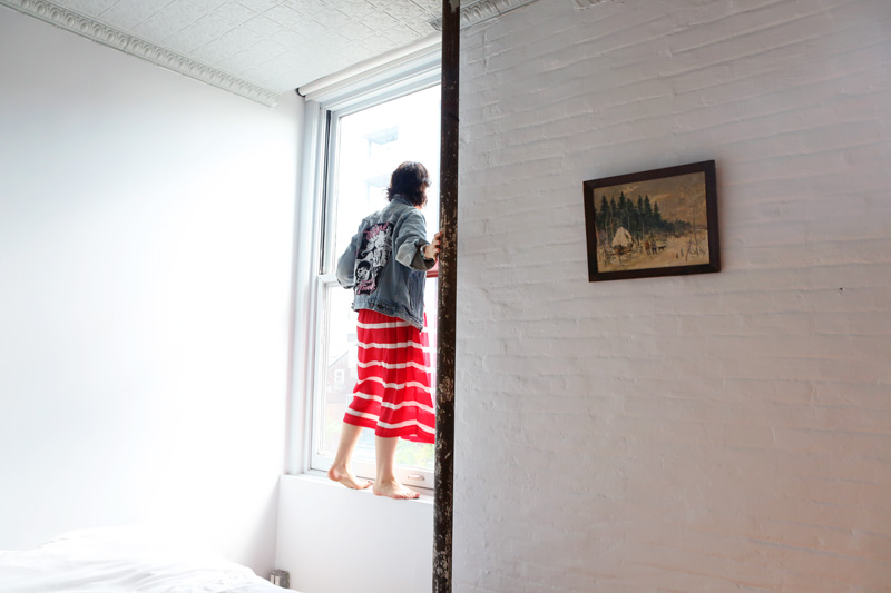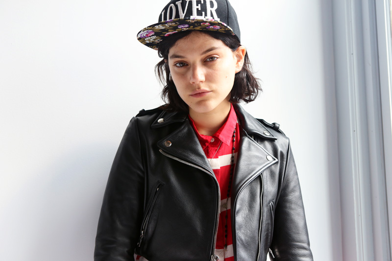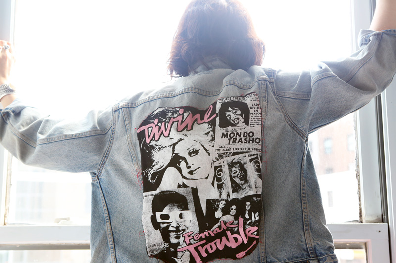 Style-wise, I dress really feminine. I like vintage dresses paired with something like a crazy jean jacket with Divine on the back of it, like the one I have on now. It says 'Female Trouble' across the back, which is a John Waters movie. Divine was one of his muses. This one is made from a t-shirt that I put onto a vintage jacket. I buy a lot of vintage—my storage unit looks like a vintage store. It’s full of clothes, furniture, rugs, and all of that. I feel like vintage clothes have a story, so I have a hard time getting rid of them. I do give a lot of stuff to my friends, though. My 'Rap' hat is from a vintage store in LA called Freak City. I also like to shop for things at flea markets like the Rose Bowl in LA. Vintage dresses are the best. They're so comfortable, it feels like you’re wearing your pajamas.”