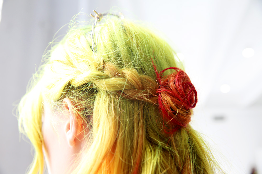 Right now it’s sort of like 'fire,' which I did myself three weeks ago—I always dye my hair myself. The yellow is Manic Panic Electric Bana na. The orange is some weird brand, and the red is Beyond the Zone. I just get gloves and get really messy. It’s like painting. I’ve fucked up so many towels and bathrooms. When I go to the beauty-supply store to shop for dye, I decide based on the colors available, not the brand. But I do like Manic Panic—some of their colors, like this yellow, glow in black lights. So when you’re out at night, your head is literally glowing, which is amazing.