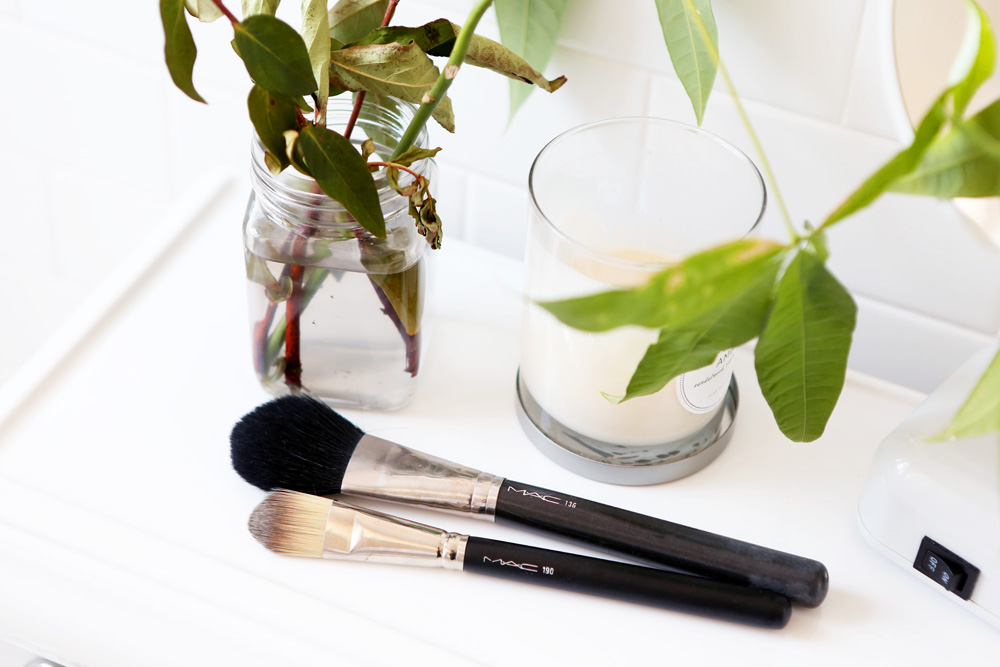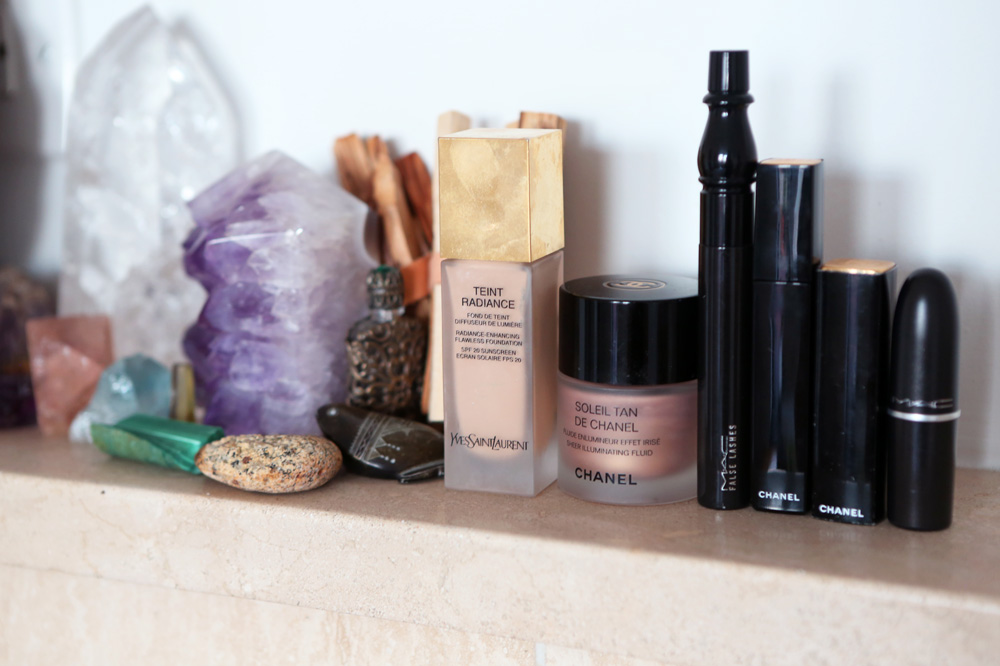 For the rest of my face, I've been mixing Saint Laurent Teint Radiance Fluid Enhancing Flawless Foundation with my moisturizer, and then just smoothing it over with MAC’s 190 brush, which makes it all slurp into your skin for a smooth, matte finish. At the moment I’m into matte skin, but I go back and forth between matte and dewy. For a bit of a sheen, I love Chanel Soleil Tan de Chanel Sheer Illuminating Fluid—just a teeny bit on my cheek and then that’s it. You don’t have to do anything else.