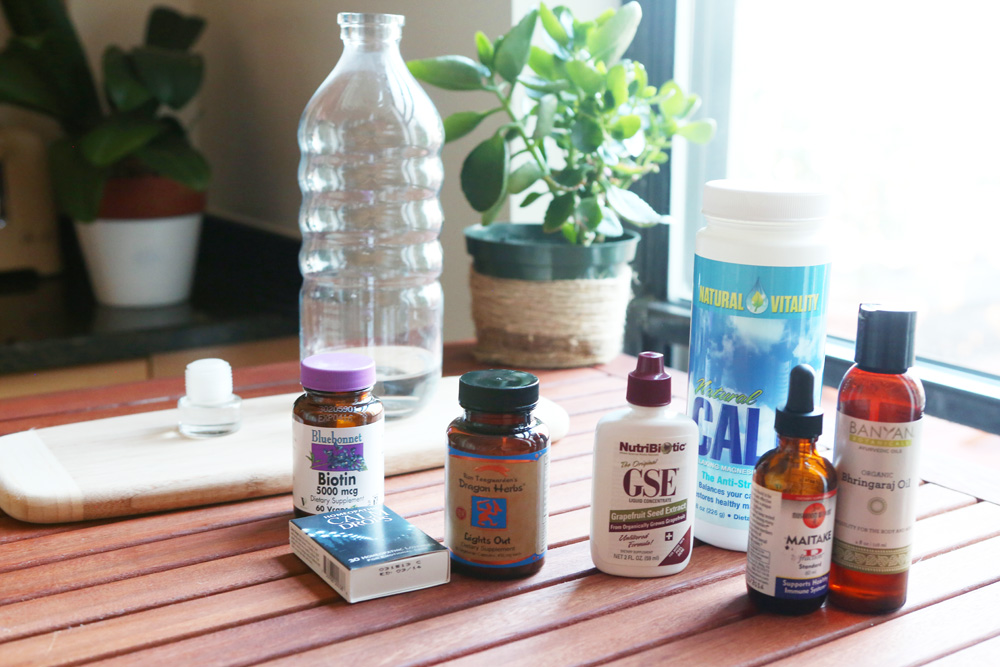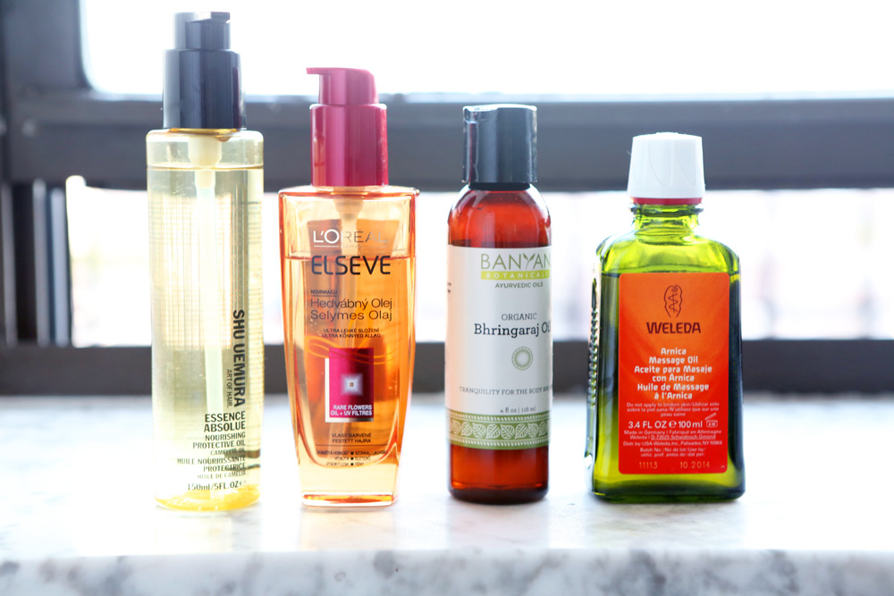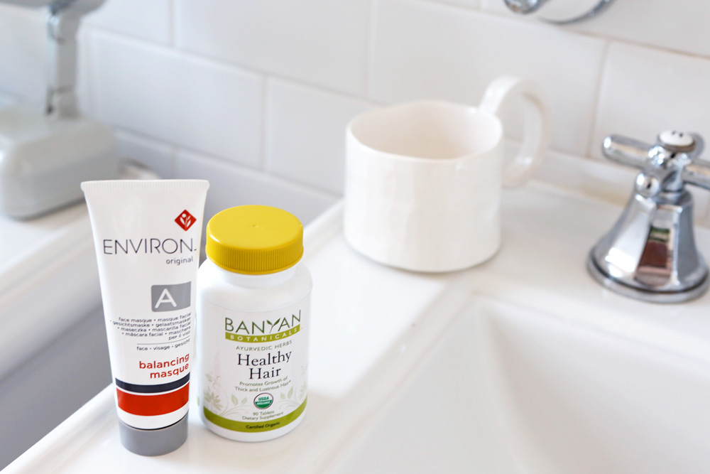 My hair is long. But I’ve been stressed lately, so I’ve been really concerned about my hair thinning, which can be a side effect of stress. My friend got me this incredible stuff from Christophe Robin called the Cleansing Mask with Lemon. It’s the most stunning thing in the entire universe, and makes my hair feel incredible. You put the mask on dry hair, and then you work it into kind of a paste-y lather, starting at the roots, and working it down to the ends. You add a drop of water at a time, and then, finally, rinse it out. The whole process is like a very gentle shampoo that takes at least twenty minutes—minimum—but it’s worth it. Otherwise, I like to wash with Shu Uemura Moisture Velvet Shampoo and Conditioner. I like the way it smells, and then I love to put arnica oil all over my hair. I’ve been doing a lot of Ayurvedic stuff too, like this Banyan Botanicals Bhringaraj oil—a creative-smelling hair oil [Laughs]—and Banyan Botanicals Healthy Hair Supplements, which I take once a week. They nourish your hair and promote growth.