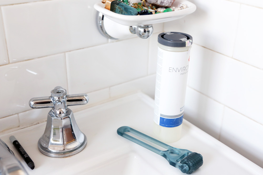I’m a little bit skin-obsessed. First thing in the morning, I’ll just rinse, and then put on Perricone MD Cold Plasma. Sometimes I’ll follow that with Perricone MD Acyl-Glutathione Eye Lid Serum. At the end of the day, I cleanse, tone, and then I use Environ’s Cosmetic Roll CIT. It’s a little roller that you push over your face, and it has microscopic needles that poke your skin. It sounds scary but it makes you absorb your skincare products something like 900% better. I’ve been using it for four weeks, and it has totally evened out my skin texture. I have freckles, which I love, but when they all clump together, they can give my skin a patchy texture and look—it makes me look a little haggard. But the Cosmetic Roll has made an obvious difference. Even I can see a change, and it’s so hard to notice things on yourself.