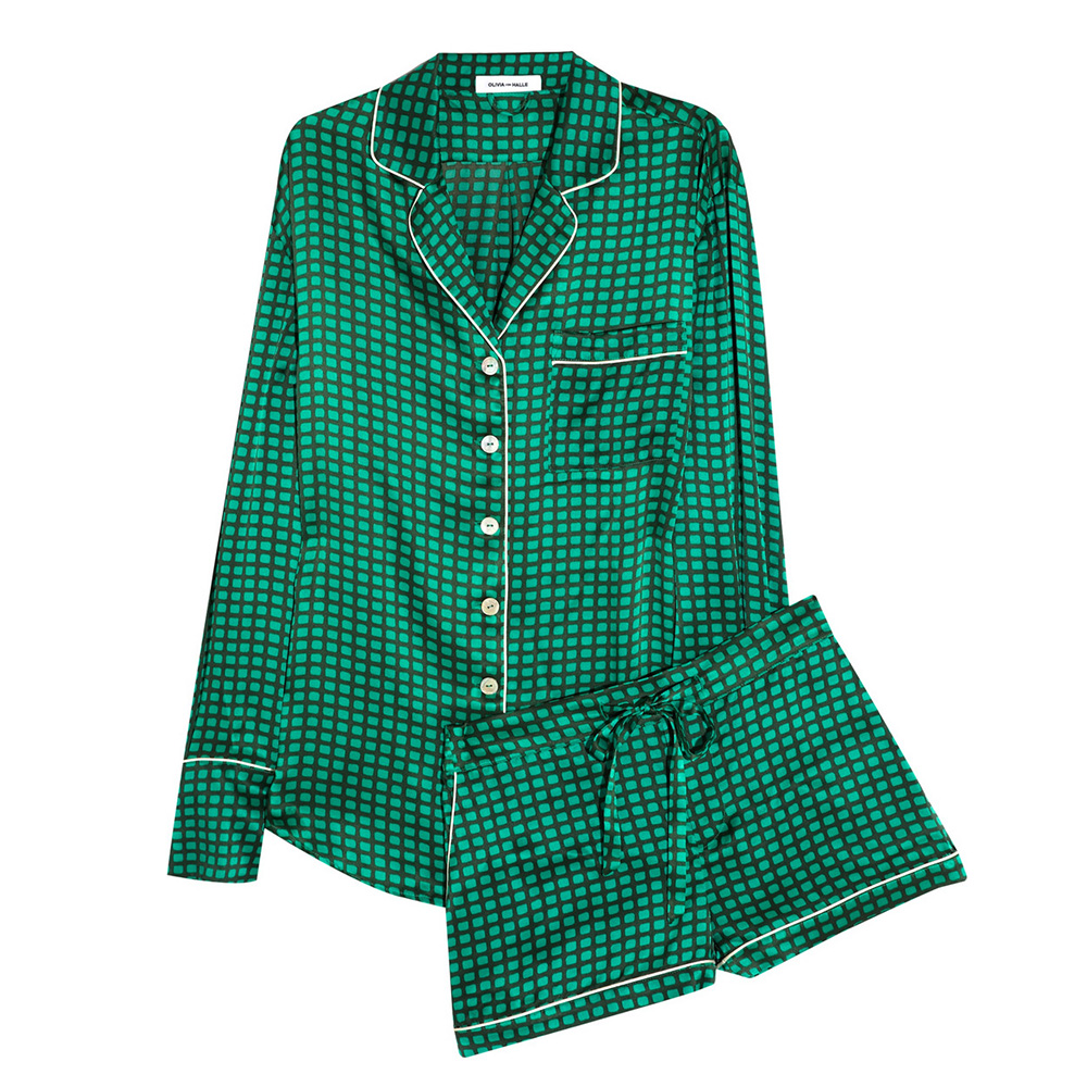 Olivia Von Halle Alba Maria Printed Silk-Satin Pajama Set : Leave it to Net-A-Porter to sell an impressively stylish pair of silk pjs. No, they're not a 'steal,' but the set’s silver lining is your passport to don this late-eveningwear during the day (or, earlier in the evening). For adventurous 9-to-5-ers, might I suggest going full-throttle in both pieces plus a sweater and/or light jacket, and accessorizing heavily? And to the more conservative among us: the green checked top is an easy topper to classic denim.