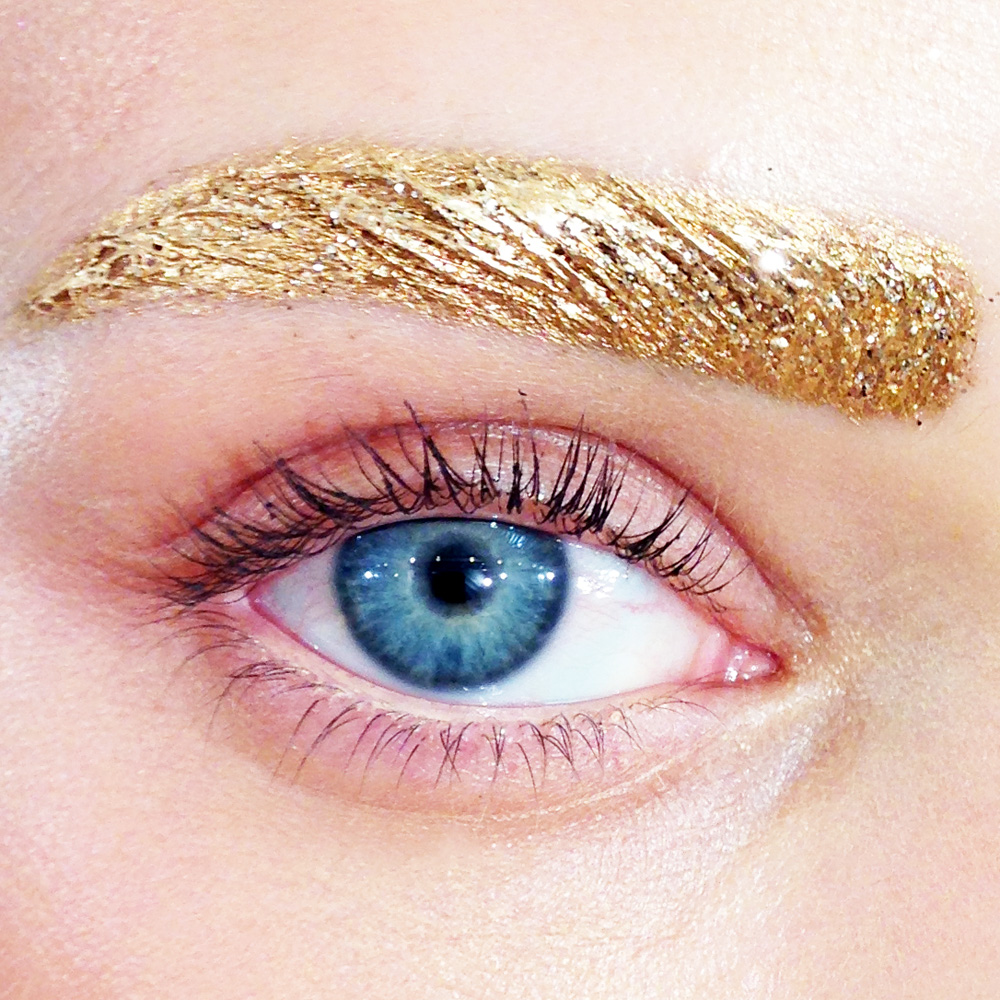 Some girls have just the brows, some girls have both a gold eye and a gold brow, and some girls have just the eyes. For the eyes, we painted on the pigment, and added a flash of pastel with blue, green, or yellow eyeliner very close to the lash. We finished them with brown mascara.