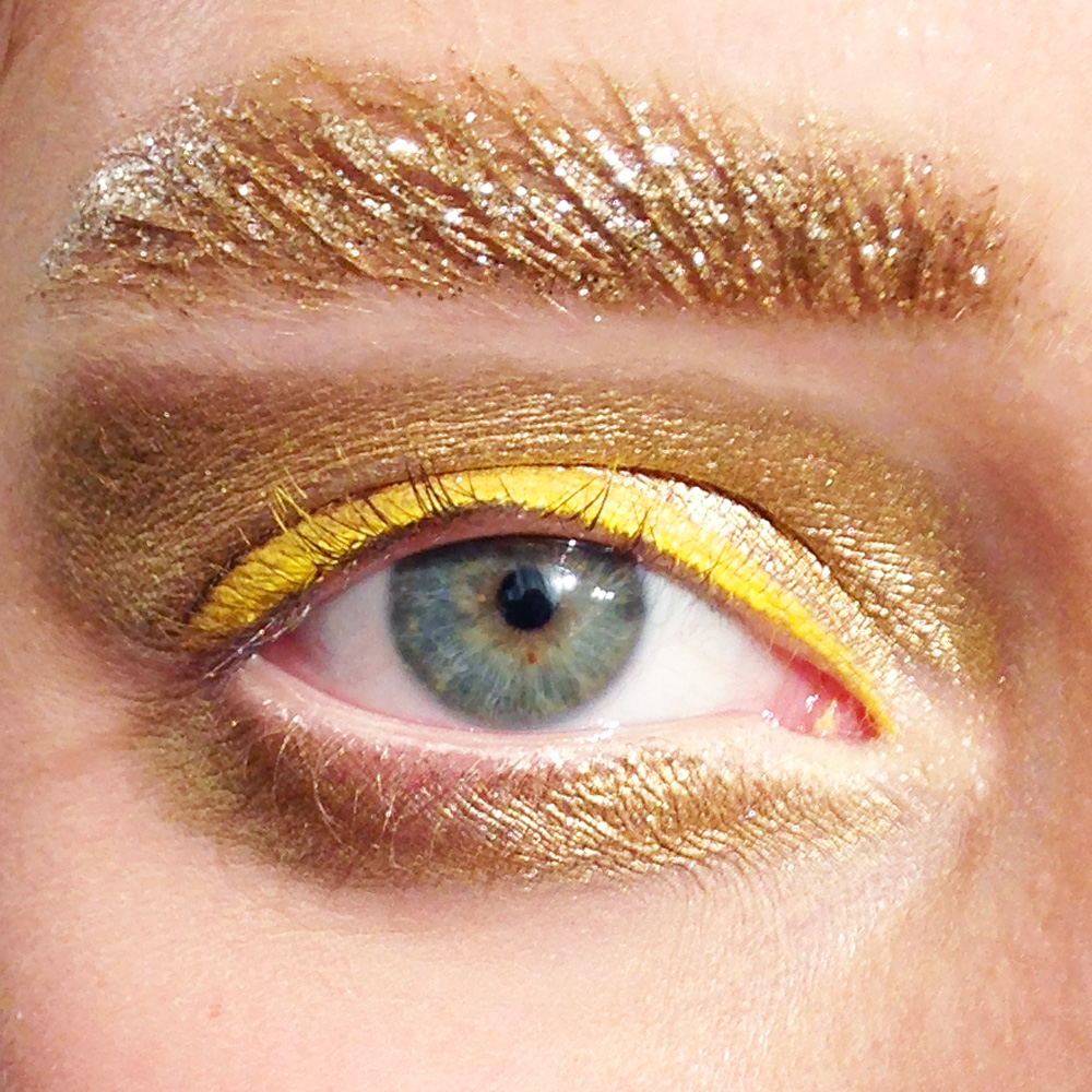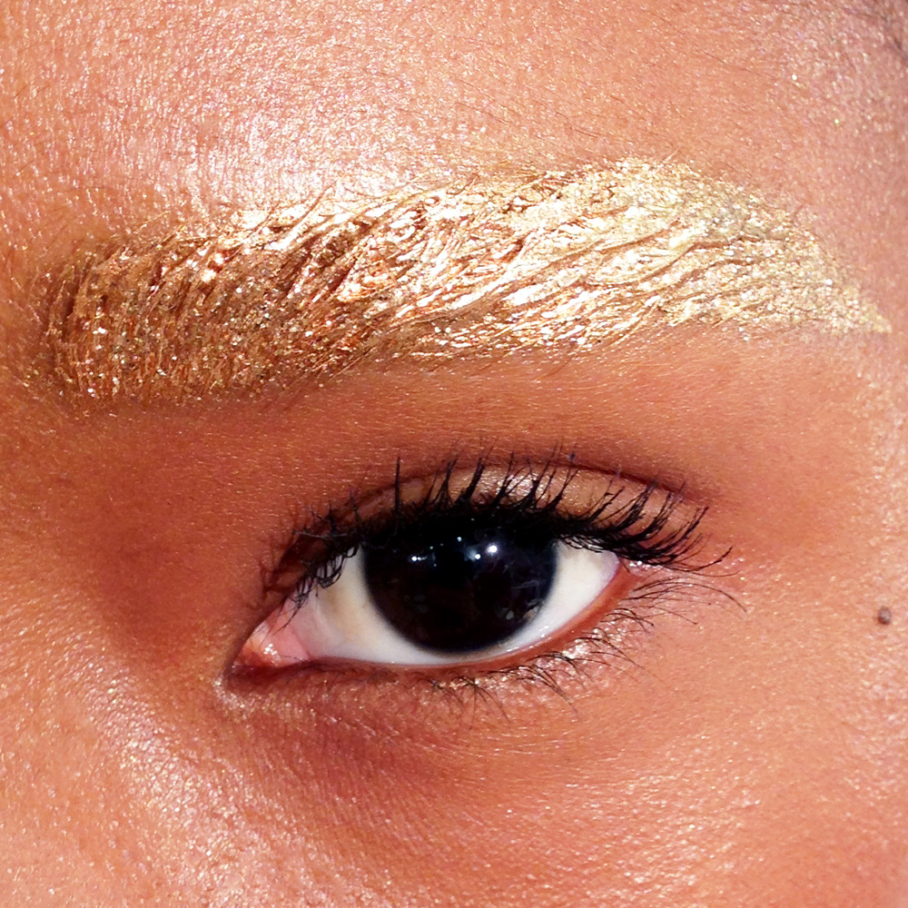 Pat McGrath : “These eyebrows are like jewelry. Working with the natural brow shapes, we applied glue, gold pigment, and gold glitter in many layers to create a brocade texture. It’s a real build. To get it right, we just painted on the pigment and wiped it away. We were really having fun. The glue was used to ensure that the gold stayed for the full show. And we decided on gold because it feels both organic and futuristic.