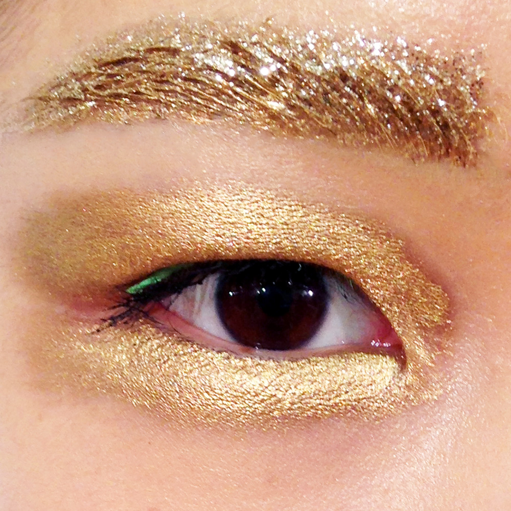 Every once in a while during fashion week, something so spectacular happens backstage in makeup or hair that we can actually feel the paradigm shift. Raf Simons has been churning out moments like these since his 2012 debut at Christian Dior (with the help of one Pat McGrath). Last season’s French-kissed lips had us artfully smudging out our lipstick on our way back from the show. Spring 2013’s bedazzled eyes and lips made us get very comfortable with the idea of upping the wattage of our makeup. But this season’s look — spookily subtle gold brocade brows and metallic eyes —was the best yet. These are eyebrows as jewelry , jewelry that costs nearly nothing to replicate, yet commanded about as much attention as the clothes (which will surely cost more than nothing). Sure, you could try to get yourself yourself on the wait list for a Céline choker, but, if not, why not just brocade your brows? Clearly, elegance isn't always expensive. Explained Ms. McGrath: