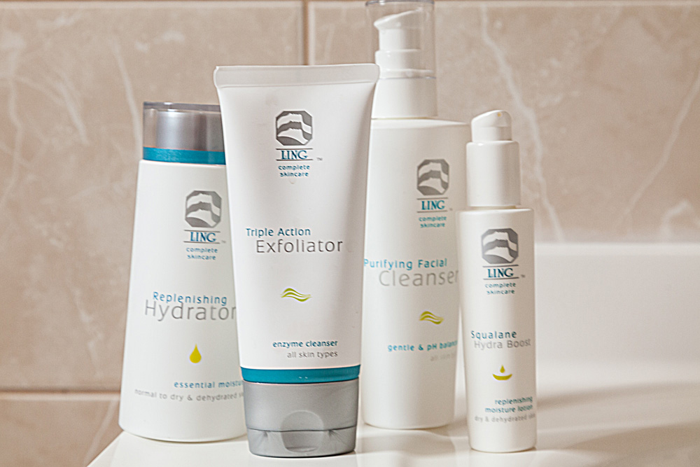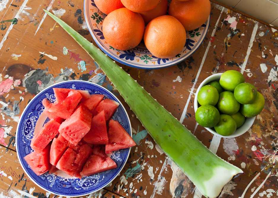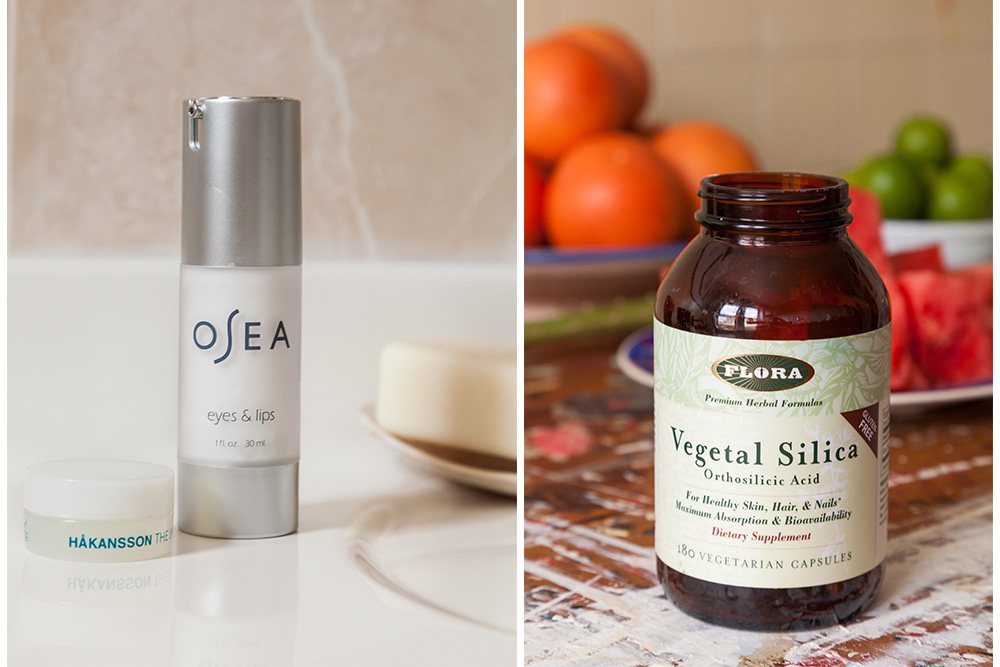 I have a little trick that Ling taught me for applying makeup versus applying moisturizer: if you think of the pores of your face like they’re shingles on a roof, when you’re applying moisturizer, you should move upward, to get the moisture up into the pores, but if you’re applying makeup, you should apply it with downward movements, so you don’t clog your pores. When I do get blemishes, aloe vera plants have been a lifesaver for me. I just cut a piece open and stick it on the blemish.