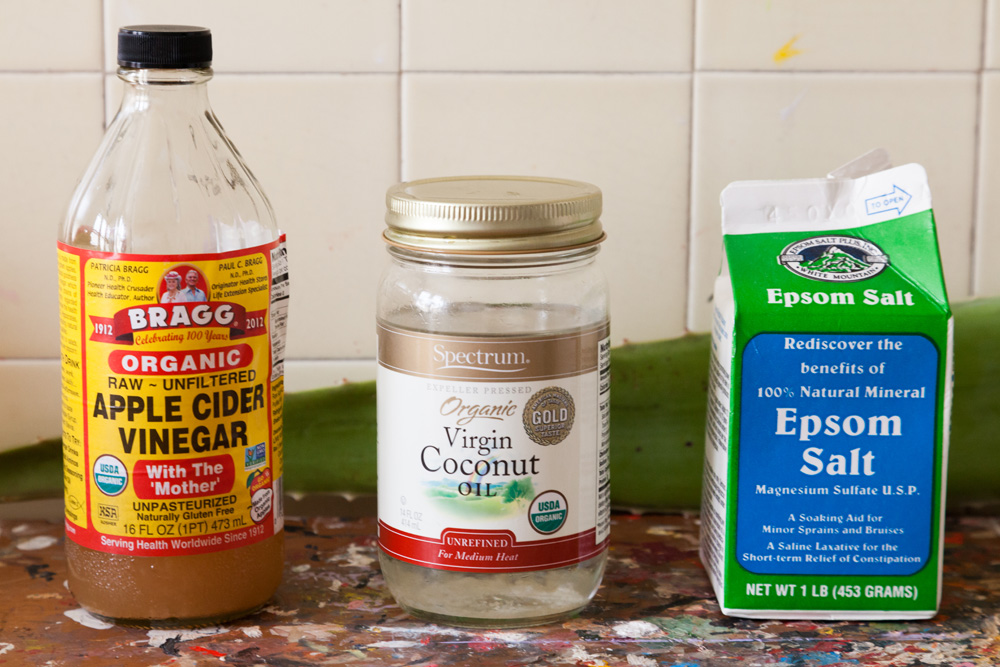 I also put the coconut oil on the ends of my hair when it’s feeling dry. Otherwise, for my hair, I like Whole Foods 365 Lavender conditioner, which is sulfate- and paraben-free. But one of the best beauty products of all time is apple cider vinegar. If you put it in a spray bottle, with equal parts vinegar and filtered water, and spray it on your head every day after you shower, your scalp will have a perfect pH balance. I massage it in and just dry my hair normally.