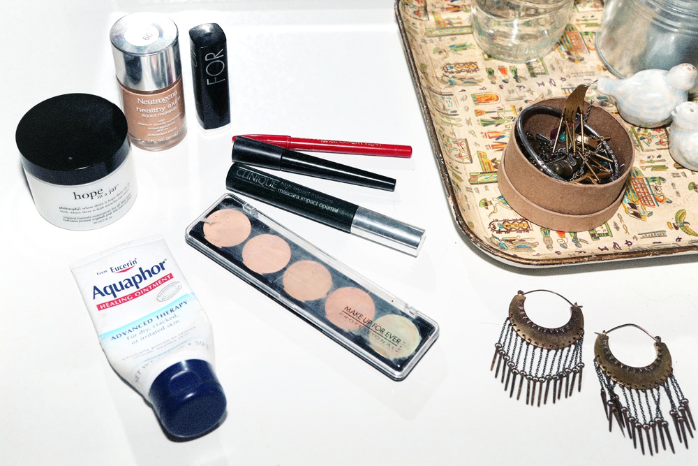 I don’t even use face wash—I clean my face with water. Then, I use a little bit of drugstore moisturizer, like Neutrogena, to take off my makeup. I put it on and rub off eye makeup with a tissue; it’s the fastest, easiest makeup remover. My main thing is Philosophy’s Hope in a Jar moisturizer. It’s so nice and thick. When I want my skin to look really dewy, I’ll put Aquaphor under my eyes at night. It just makes my skin feel firmer and moist. It’s especially good when I’m traveling, to keep my skin from drying out and over-producing oil.