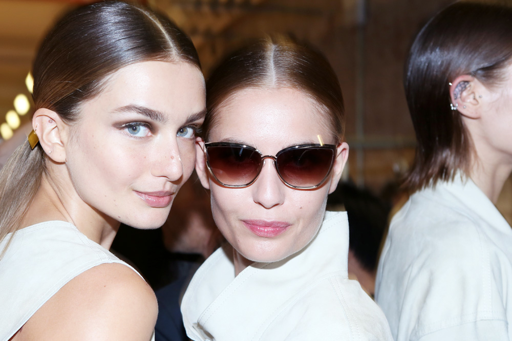 Odile Gilbert: “We wanted the hair to look ‘expensive.’ It’s slick-straight, parted in the middle, and pulled back into a low ponytail. Then, we fastened a gold barrette around the ponytail, and that’s it.