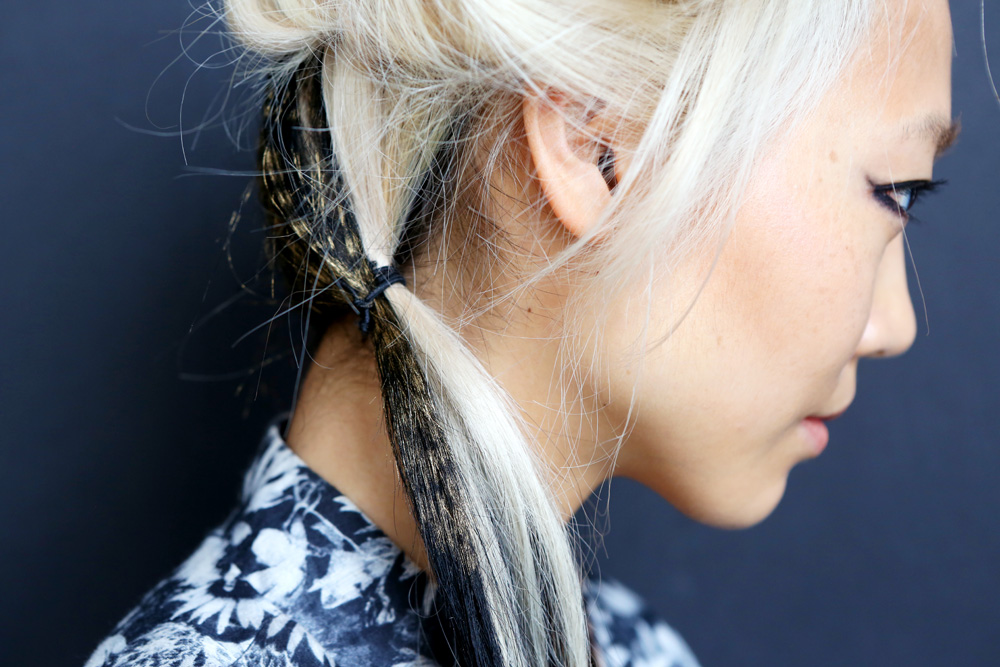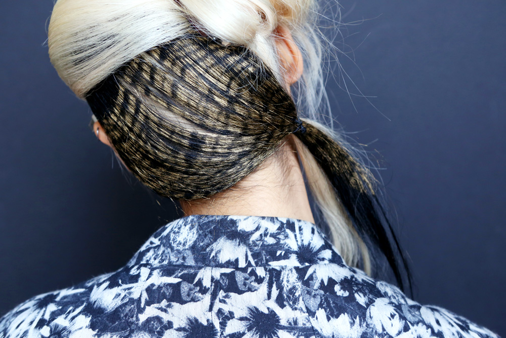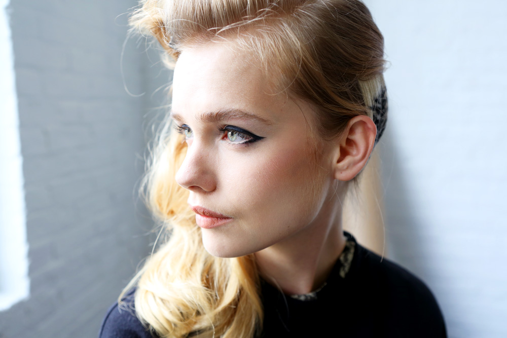 Odile Gilbert (John Frieda): “The mood for the hair is love. It’s looking to the ‘80s, but made modern by being glamorous in the front, but only on one side. We put Frizz-Ease into the girls’ wet hair, and then Frizz-Ease Curl Reviver Styling Mousse in the front to build up the volume. We blow-dried the hair using a brush and a lot of mousse, like women in the ‘80s would style their hair, did a deep side part, and made a wave in the front with a large-barrel curling iron. Then we tucked black and white zebra-printed extensions into the back of the hair, which were inspired by Rodarte’s tweed fabrics.”