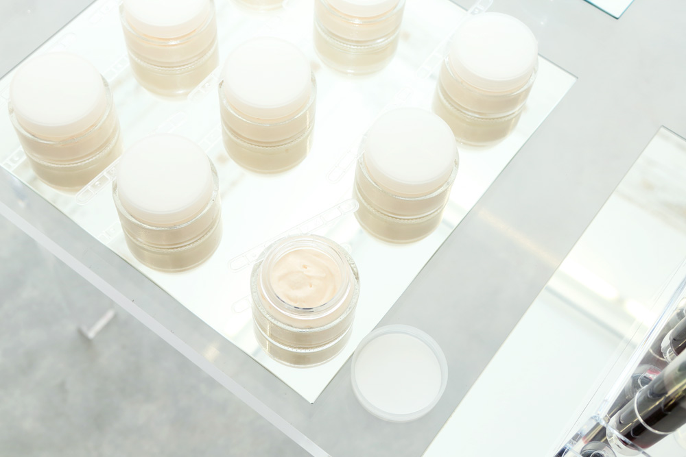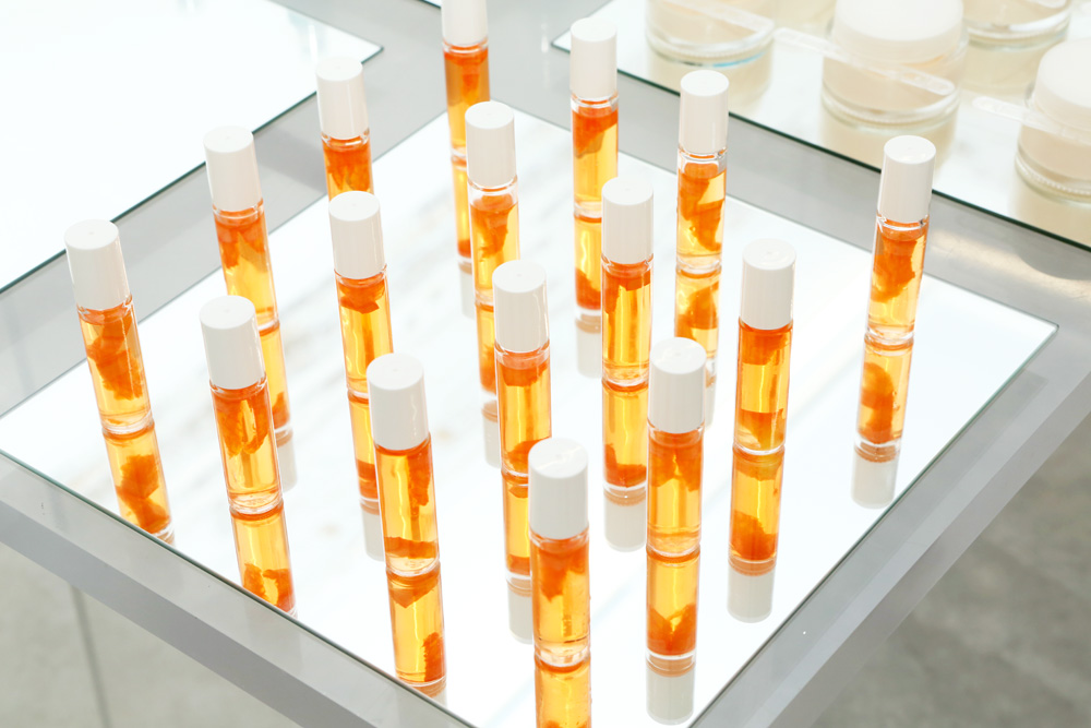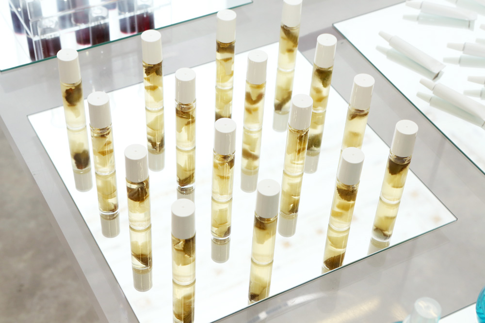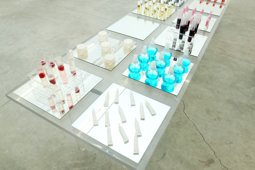 Every time I throw parties in Rome, I try to find a theme. This is my 'Vanity' party—the cosmetics packaging filled with desserts and drinks. There’s the 'Gravity' room with the jewelry, and then 'Vanity.' I found this small hotel in Rome who I collaborate with on the food for my parties, and also for this exhibit. They are crazy like me, so it’s fun. When you enter, you’re always more attracted to this side rather than the other. People all come here and forget about the jewelry. [Laughs]”