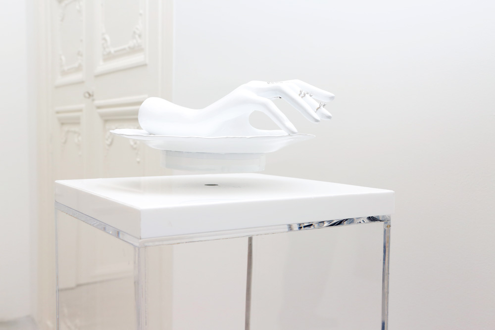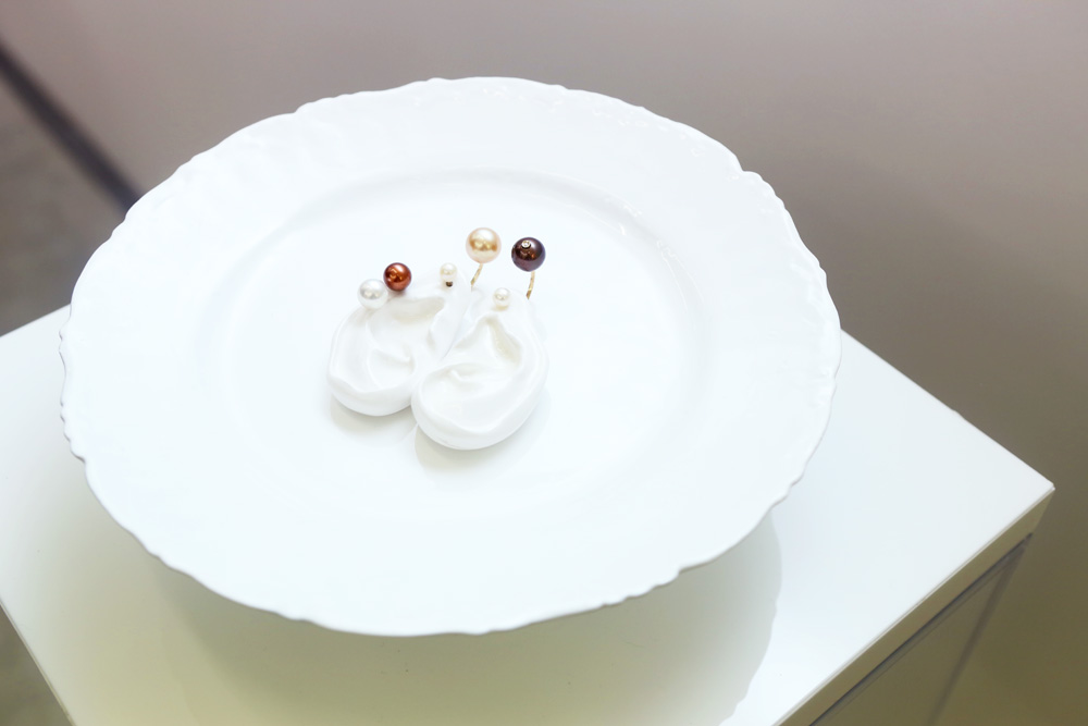Delfina Delettrez, you rule-breaker, you. Even when it comes to the physical laws of the universe — for instance, gravity—she will not be bound! Out went the skulls, eyes, bugs, and bones of her previous jewelry collections. They were replaced, for spring, with crisp, clear, larger-than-life gems that were no less unsettling. How? On closer inspection, the aqua, amber, and aubergine stones appeared to be floating on mannequin limbs: pearl earrings featured hidden cuffs as additional faux piercings, crystal rings seemed to hover in the space between fingers. And, to top it all off, each piece was displayed on levitating, spinning white dinner plates. And after you walked through the jewelry collection, you were confronted with a long table set with square mirrors, on which various multicolored tubes, jars, and bottles were placed. “Eat up!” her publicist said. It turned out the tubes were filled not with lipstick but with chocolate and strawberry fudge; the jars with Chantilly cream; the perfume spray bottles with gin and tonic; the lip gloss containers with mojitos (muddled mint and all) and Aperol spritzes; and the test tubes with Prosecco and raspberries. Cue the gasp heard ‘round Paris. Delettrez explained: